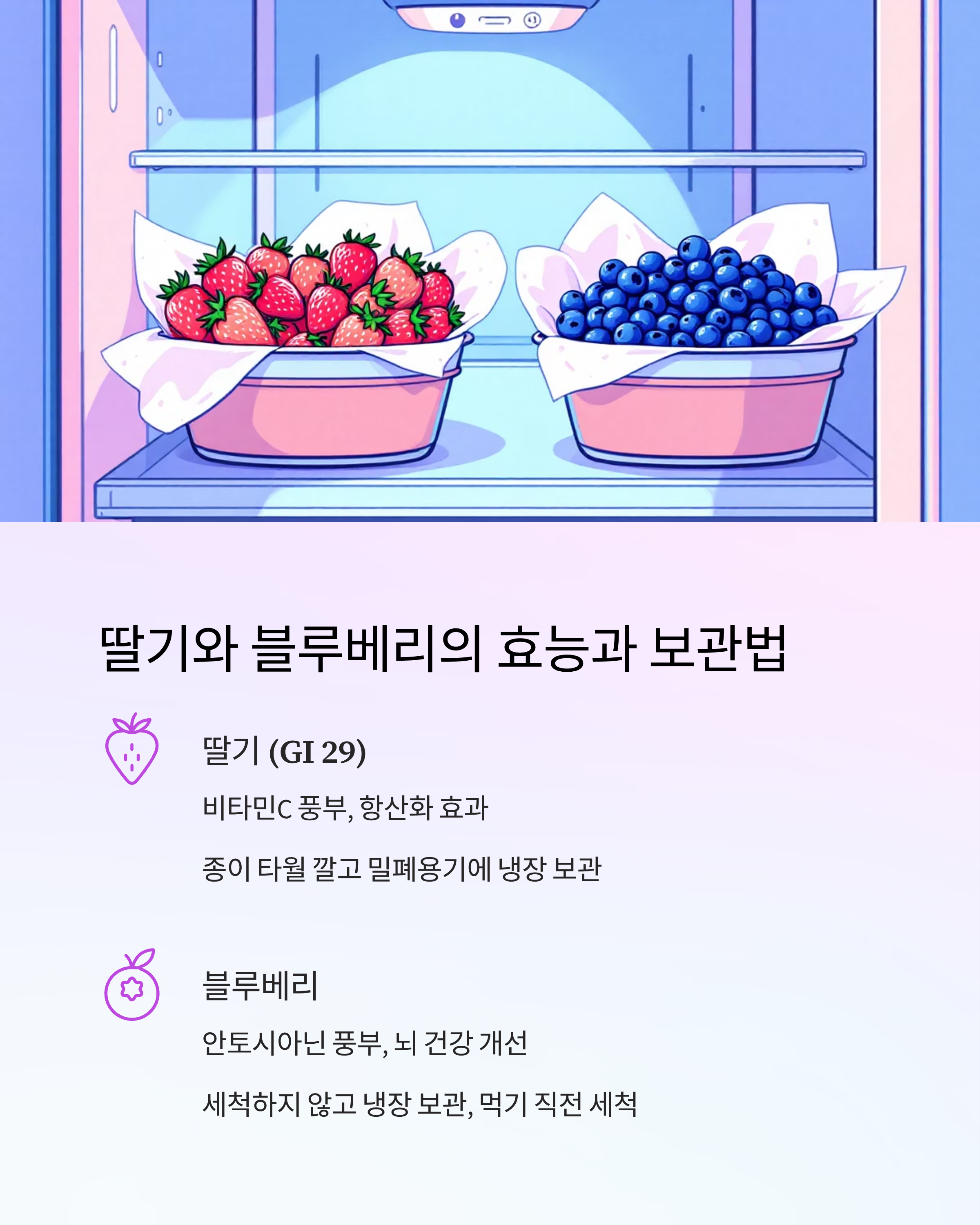 - 딸기: 종이 타월 깔고 밀폐용기에 담아 냉장 보관, 세척은 섭취 직전