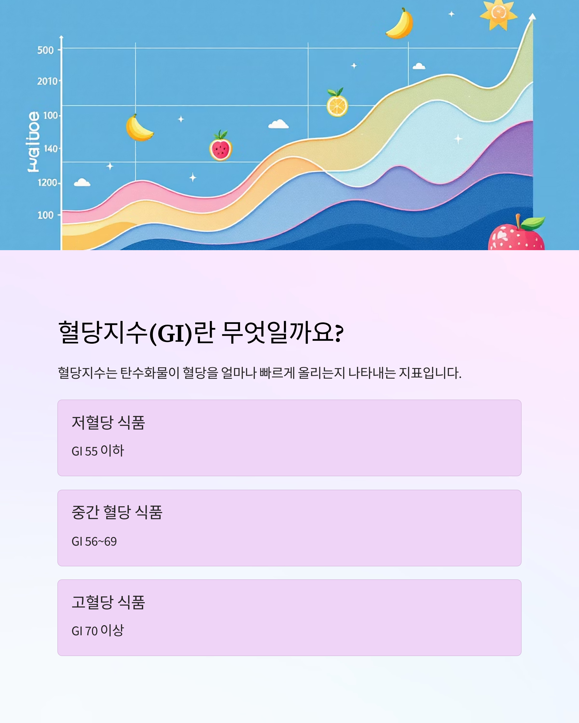 혈당지수(GI, Glycemic Index)는 탄수화물이 혈당을 얼마나 빠르게 올리는지를 나타내는 지표입니다.