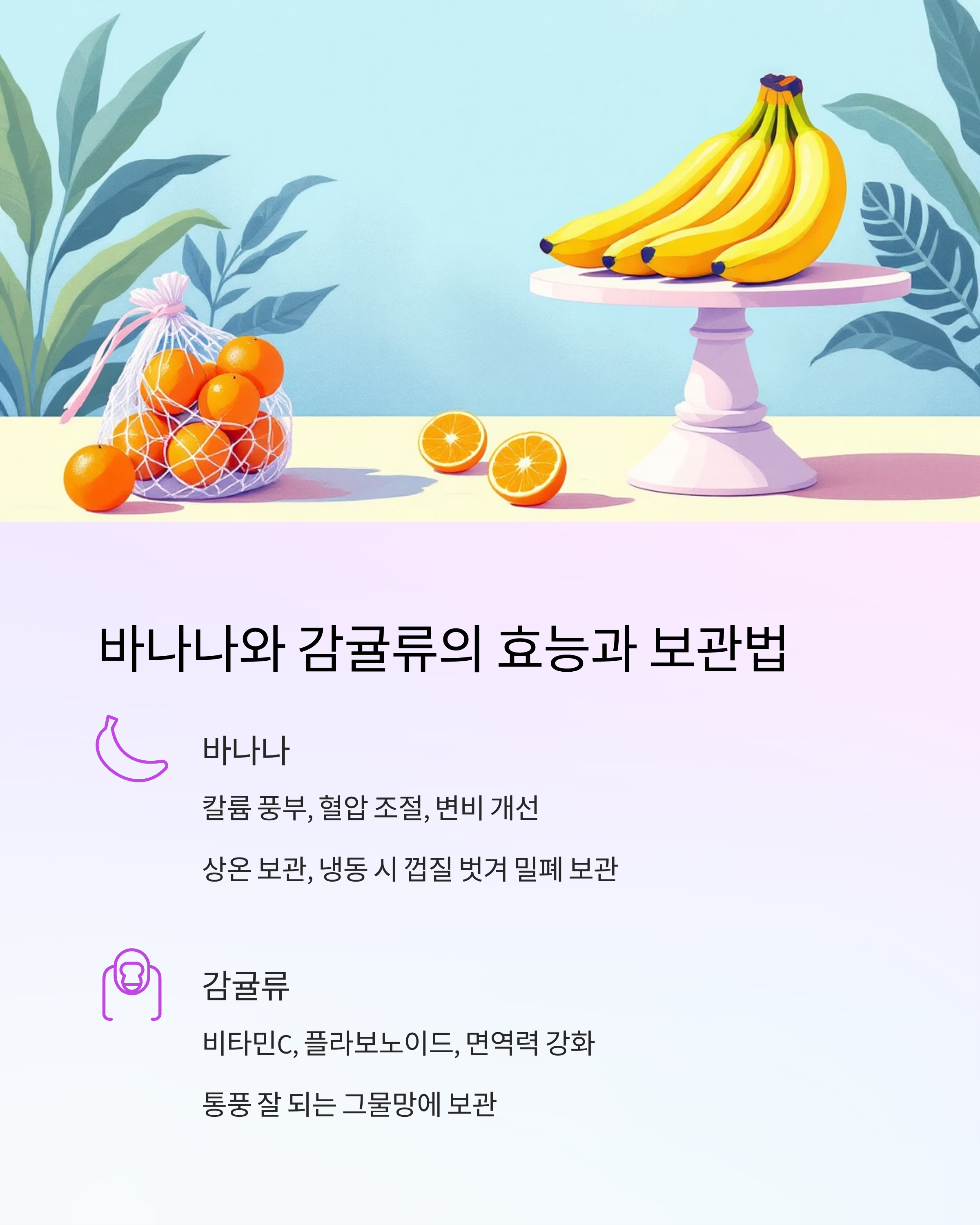 - 바나나: 칼륨 풍부 → 혈압 조절, 변비 개선