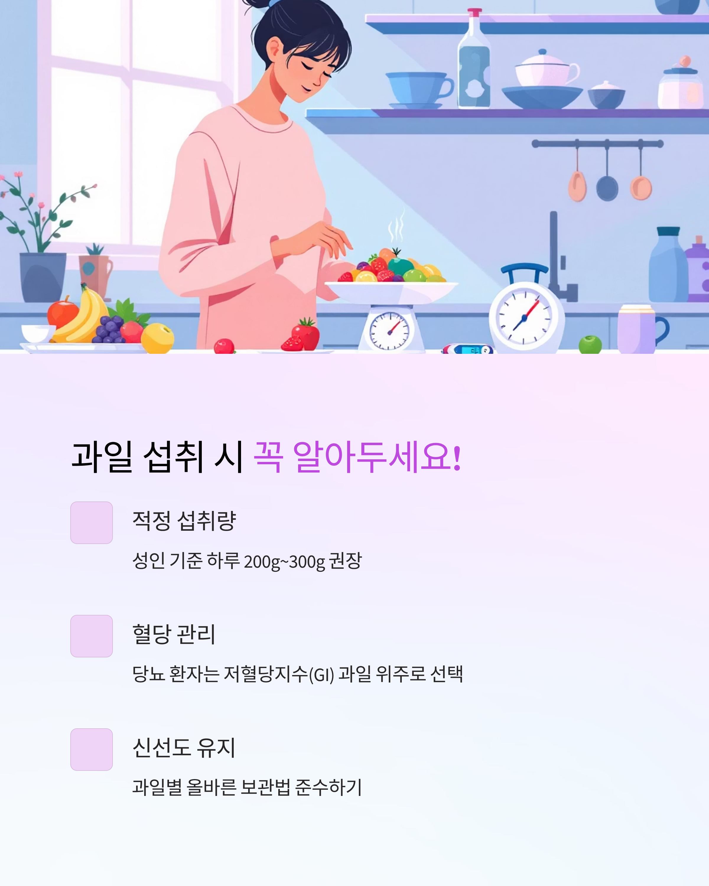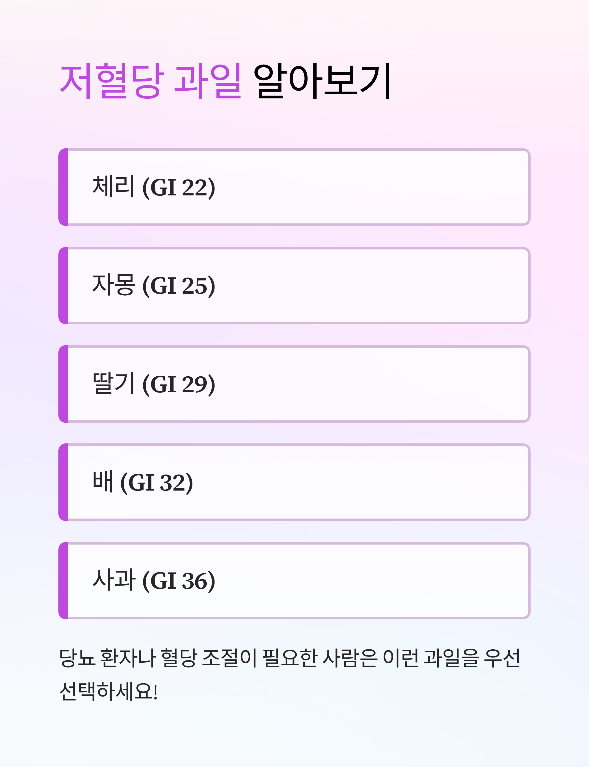- 혈당 관리가 필요한 경우 저혈당지수(GI 낮은 과일) 위주로 선택