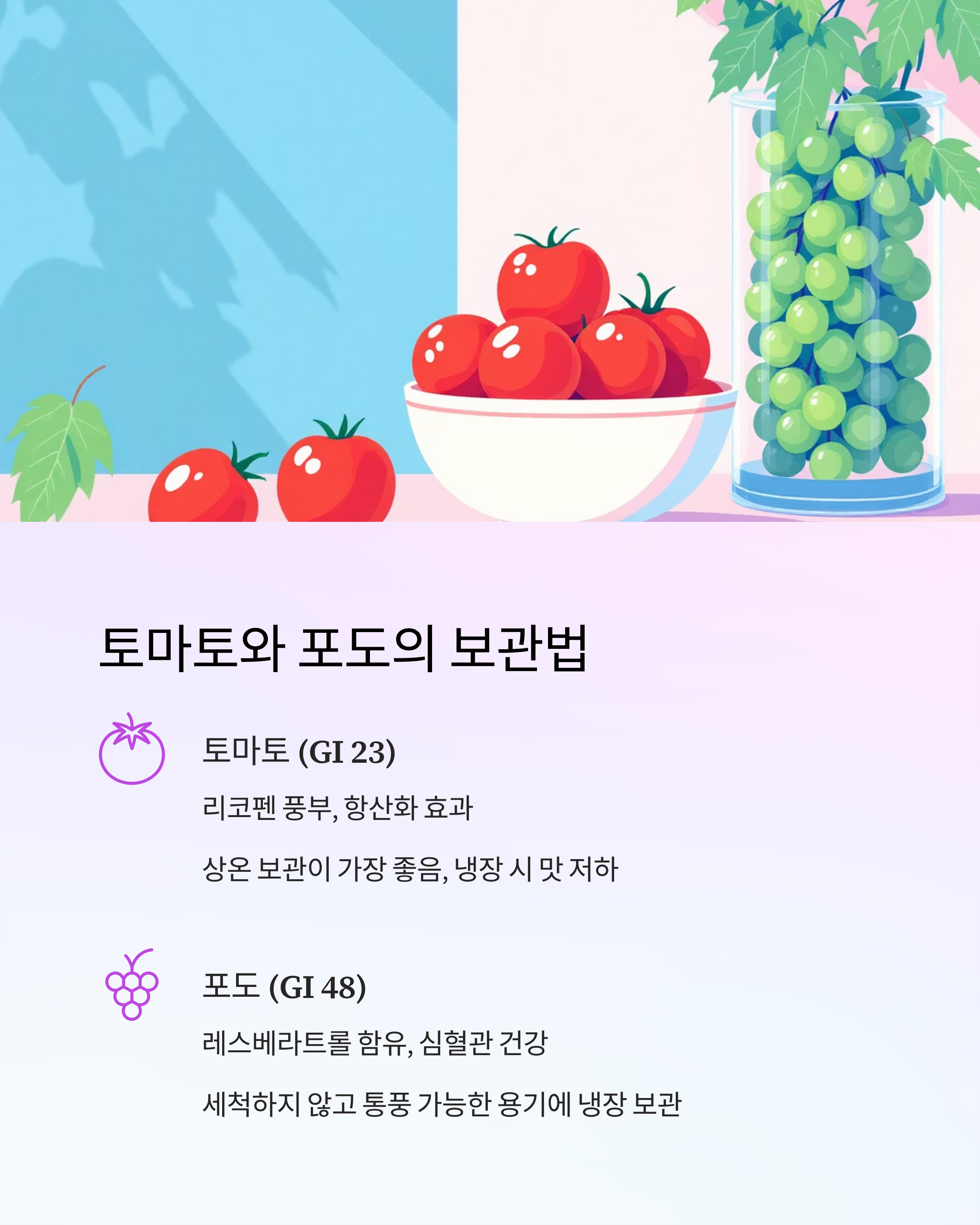 - 토마토: 상온 보관이 가장 좋으며, 냉장 시 맛과 질감 저하 가능