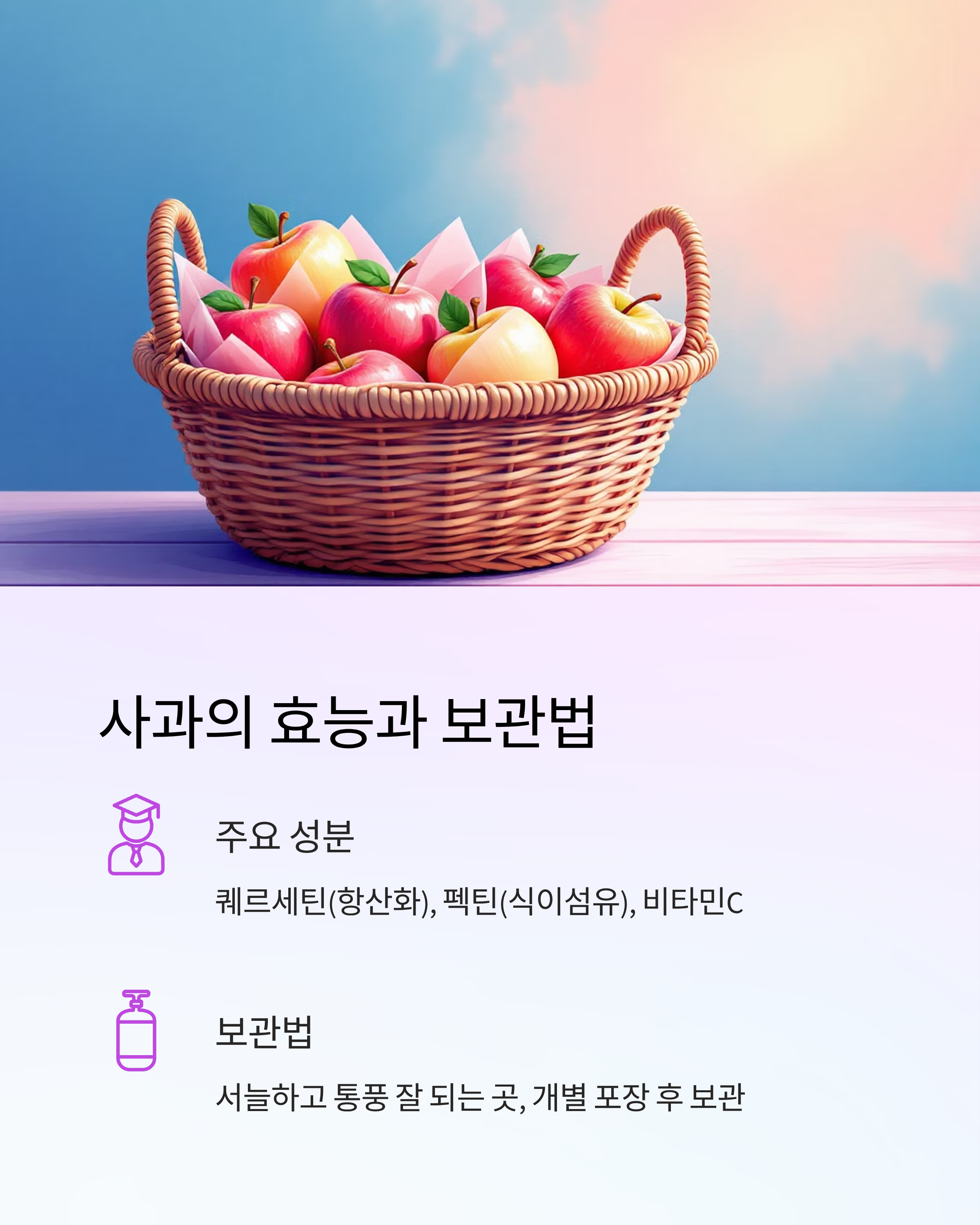 - 사과: 서늘하고 통풍 잘 되는 곳, 개별 포장 후 보관 → 신선도 유지