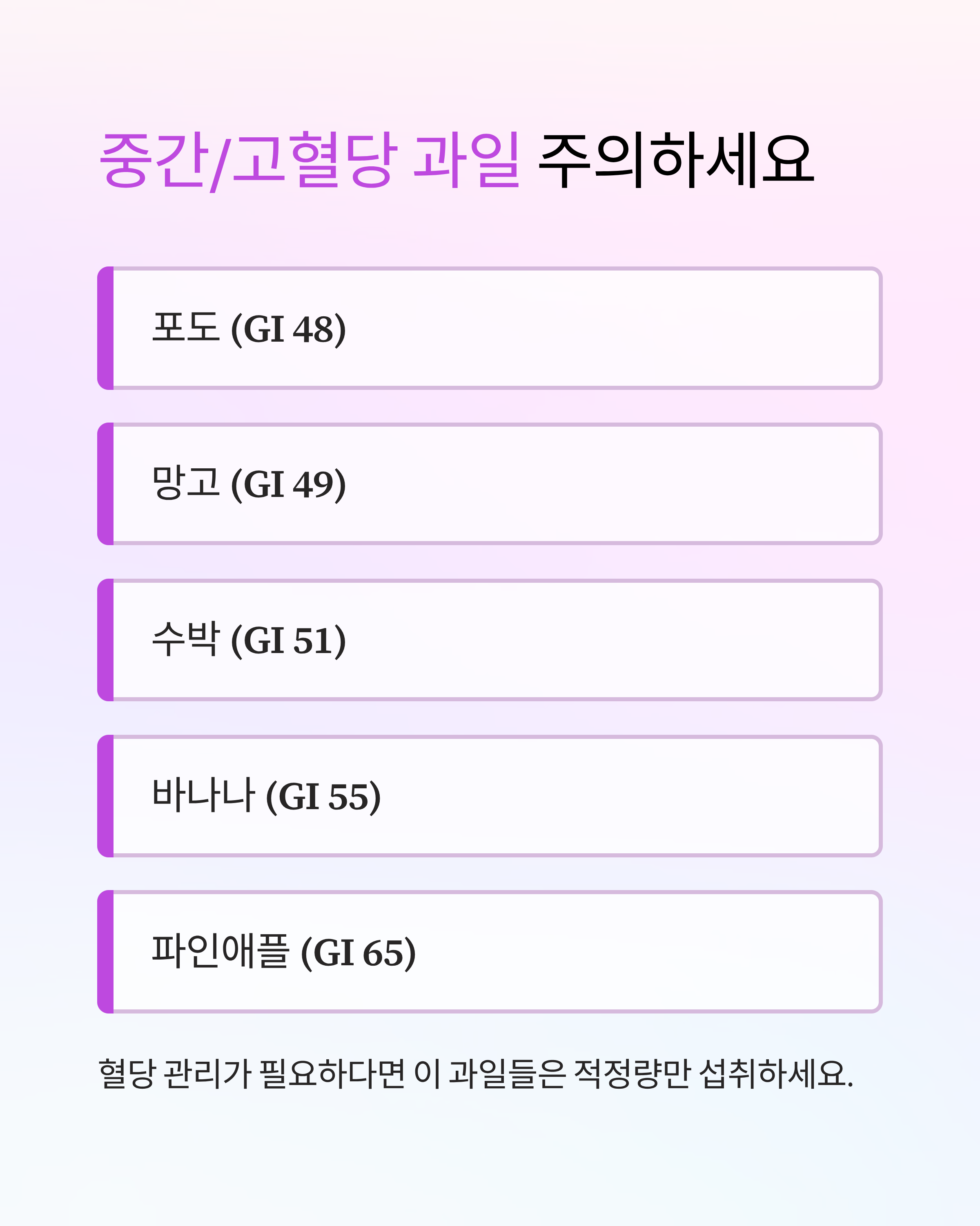 - 중간 혈당 식품 (GI 56~69): 포도(48), 귤(33), 수박(51), 망고(49)