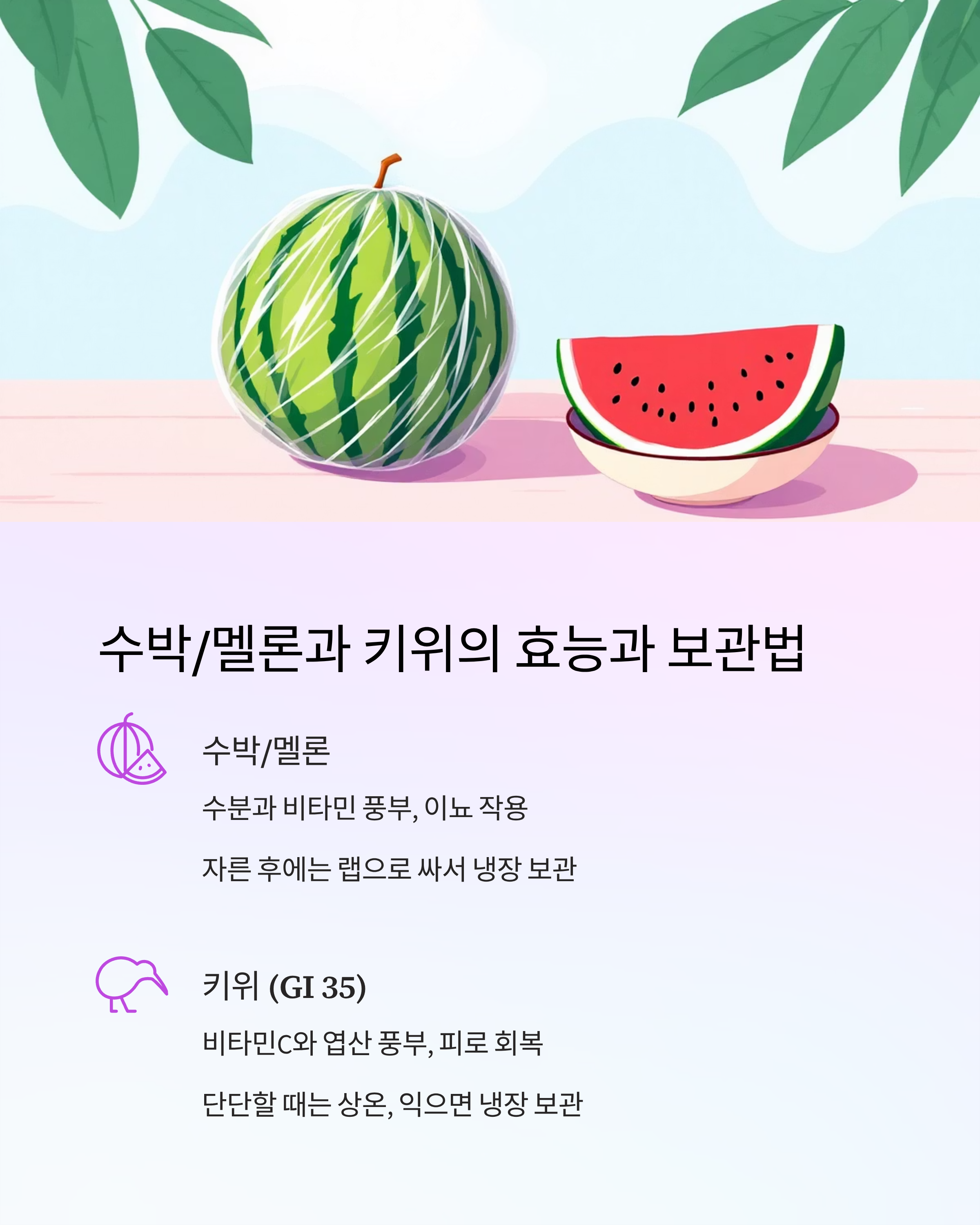 - 수박/멜론: 수분과 비타민 풍부 → 여름철 갈증 해소, 이뇨 작용
