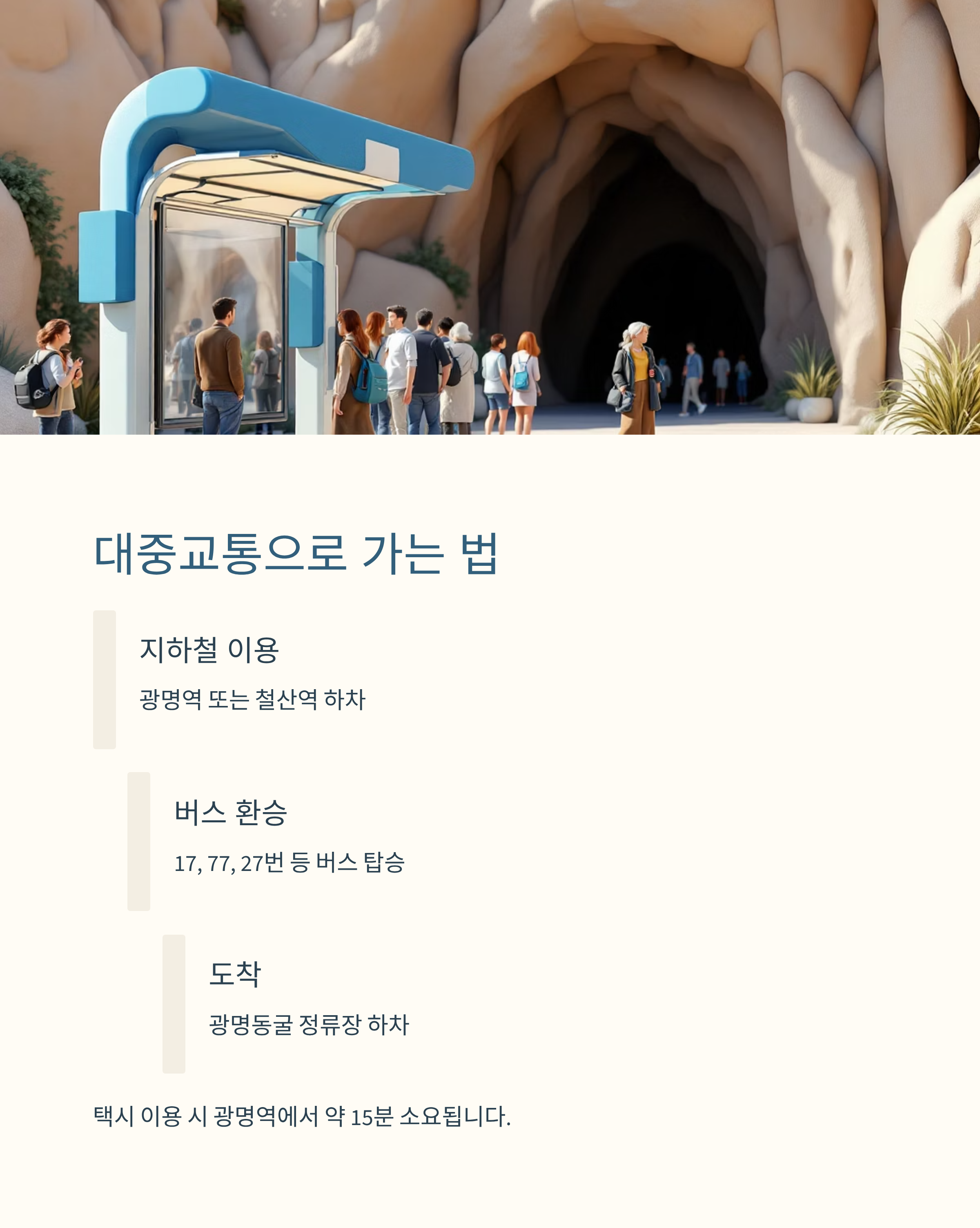 - 광명역 또는 철산역 하차 후 버스(17, 77, 27번 등) 탑승 → 광명동굴 정류장 하차