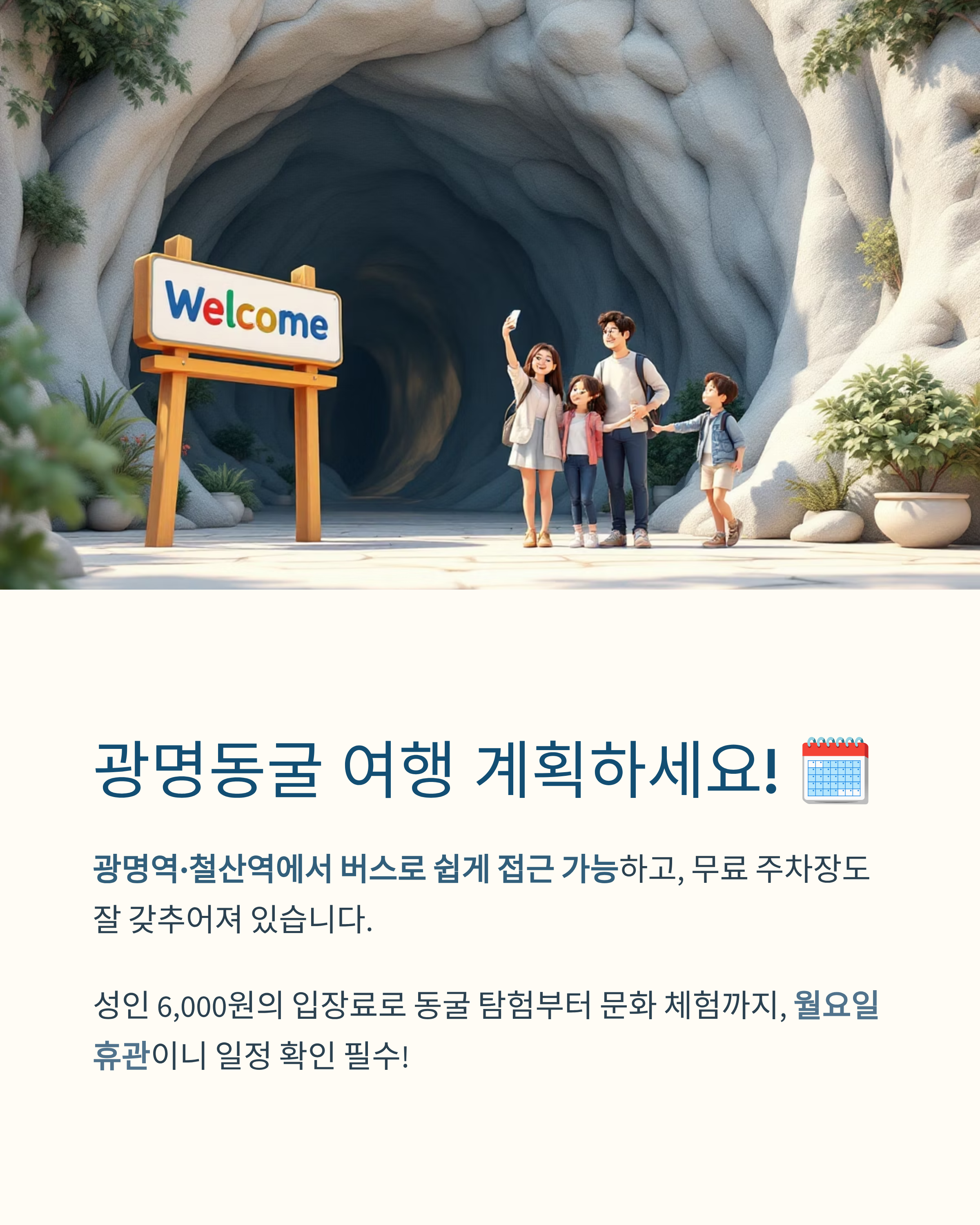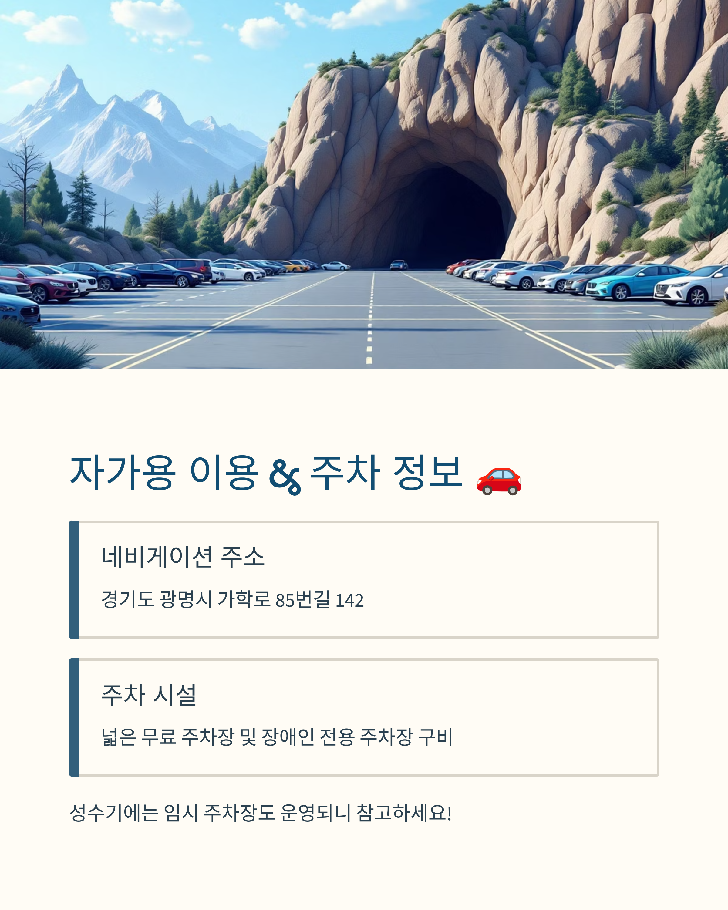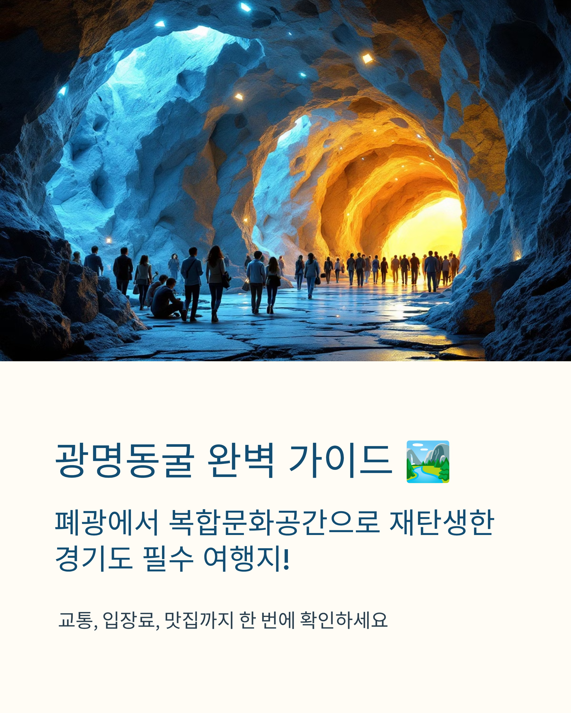✅ 요약: 광명동굴은 광명역·철산역에서 버스나 택시로 쉽게 갈 수 있고, 무료 주차장이 잘 갖추어져 있습니다. 입장료는 성인 6,000원이며, 월요일 휴관이니 일정 확인 후 방문하세요. 관광 후에는 인근의 오리주물럭, 냉면, 초밥집 등 다양한 맛집에서 식사까지 즐길 수 있어 하루 코스로 안성맞춤입니다.