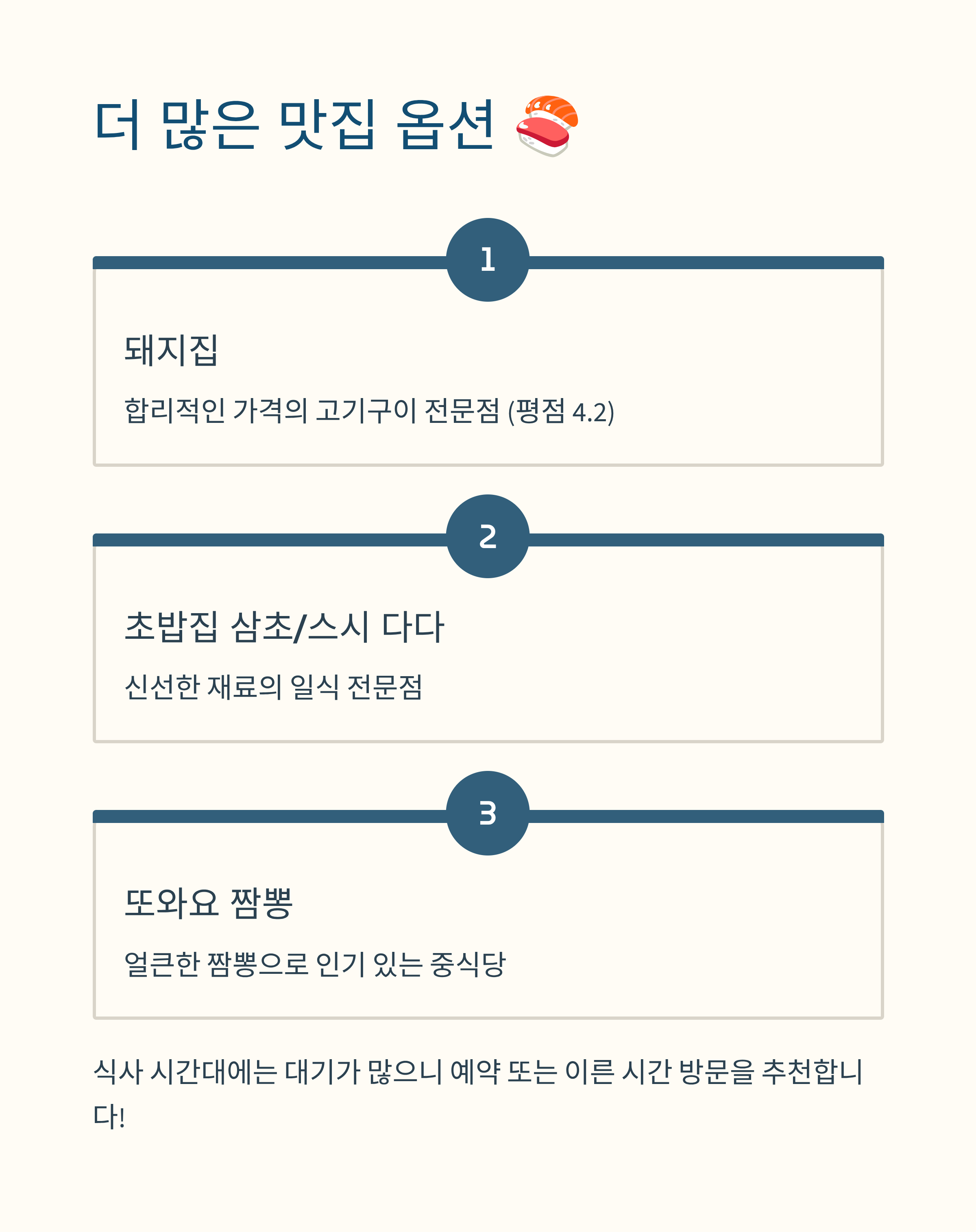 - 주변 맛집은 점심·저녁 시간대 대기가 많으니, 예약 또는 이른 시간 이용이 좋음