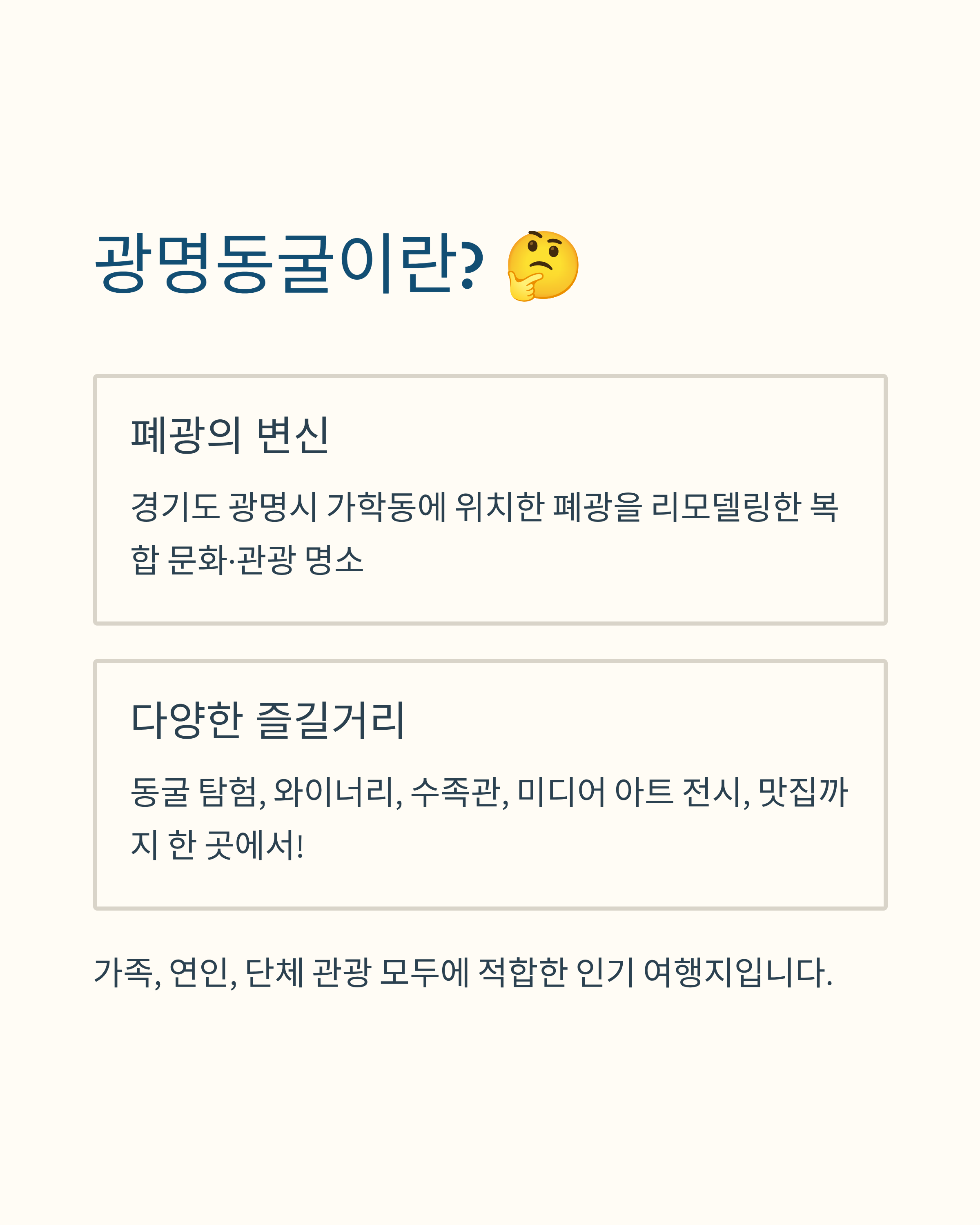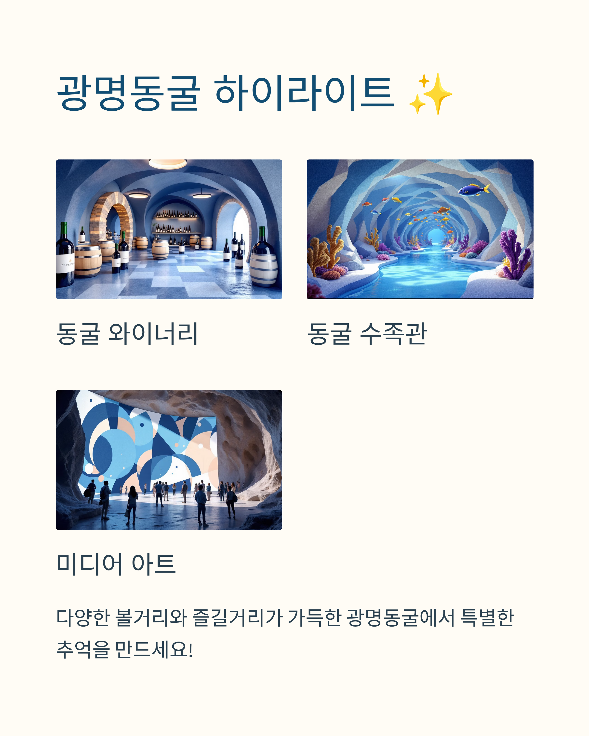 광명동굴은 경기도 광명시 가학동에 위치한 폐광을 리모델링해 만든 복합 문화·관광 명소로, 동굴 탐험뿐 아니라 와이너리, 수족관, 미디어 아트 전시, 맛집까지 즐길 수 있는 인기 여행지입니다. 가족 나들이, 연인 데이트, 단체 관광 모두에 적합한 곳입니다.