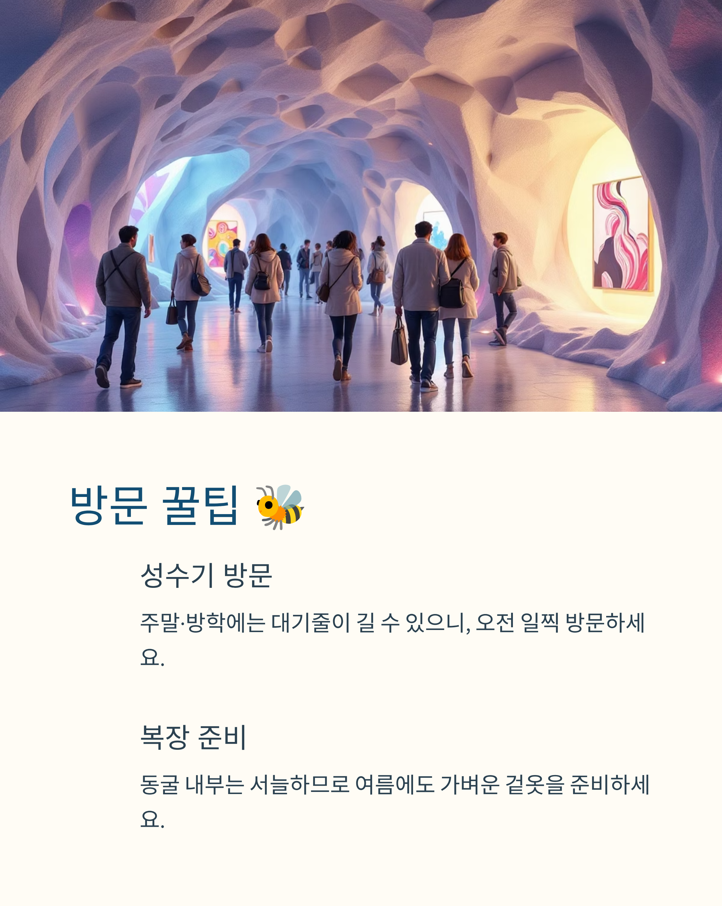 - 동굴 내부는 서늘하므로 여름에도 가벼운 겉옷 준비 필요