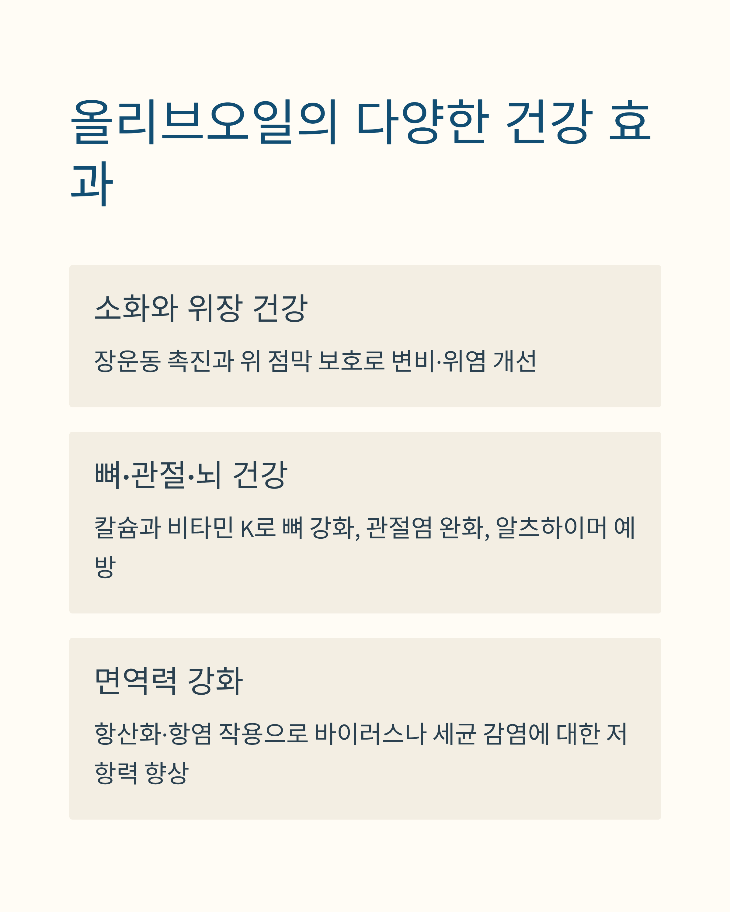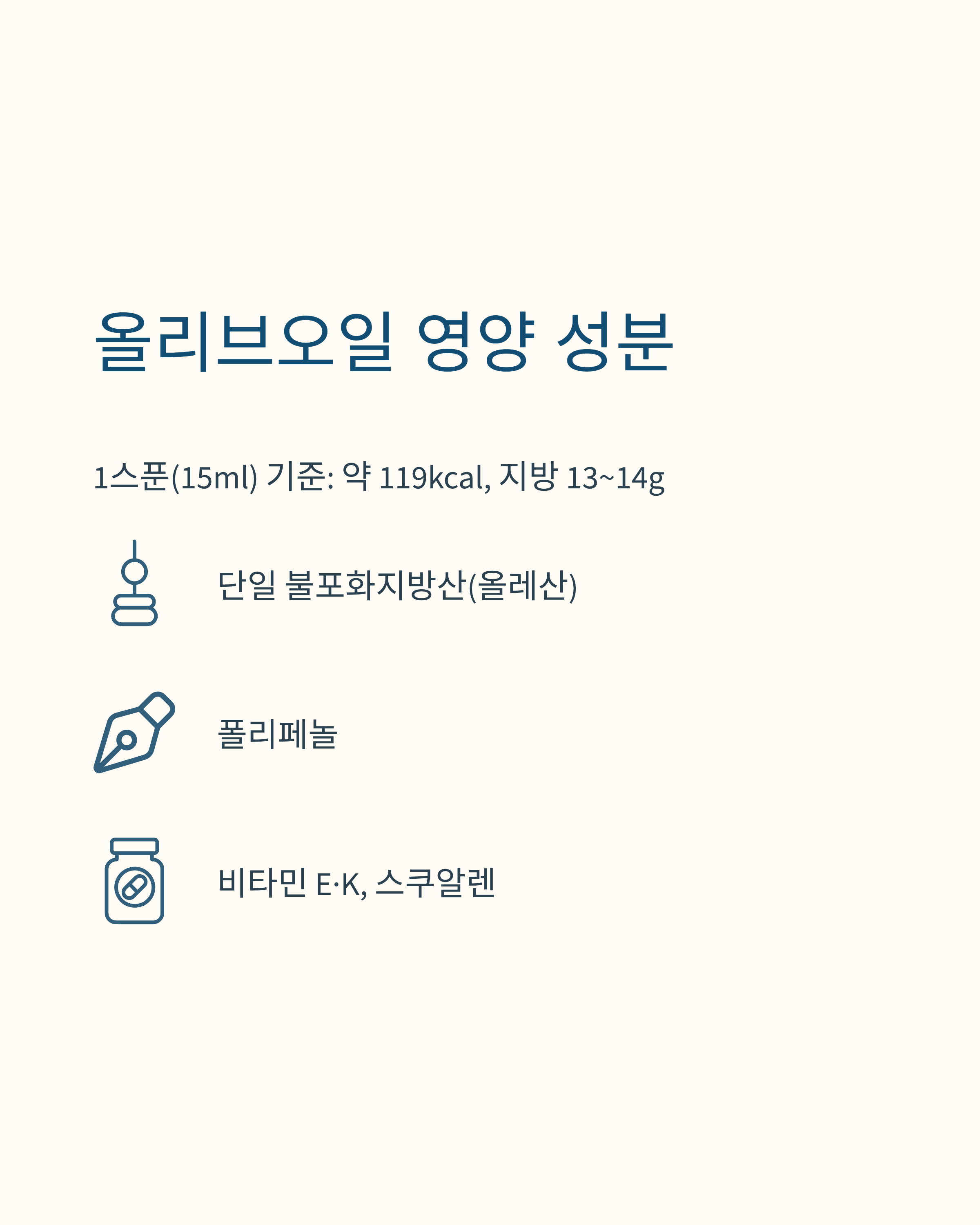 - 주요 성분: 단일 불포화지방산(올레산), 폴리페놀, 비타민 E·K, 스쿠알렌