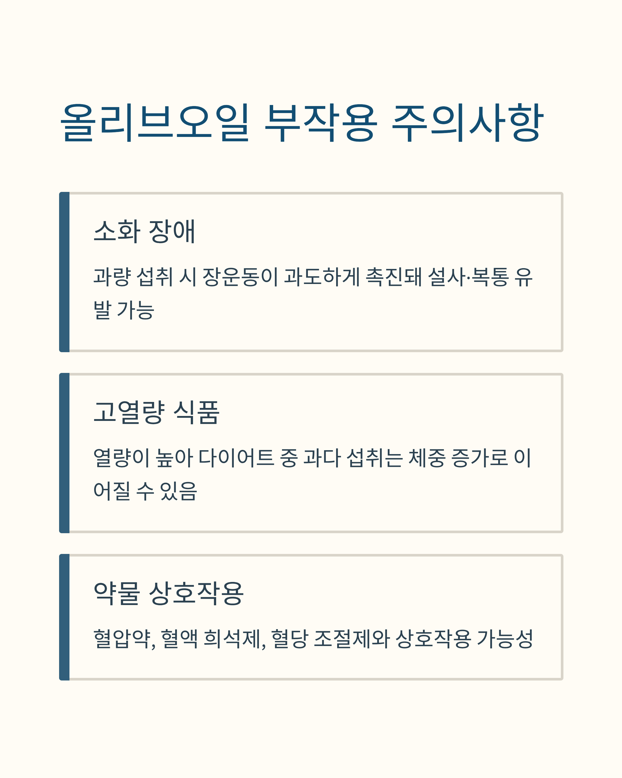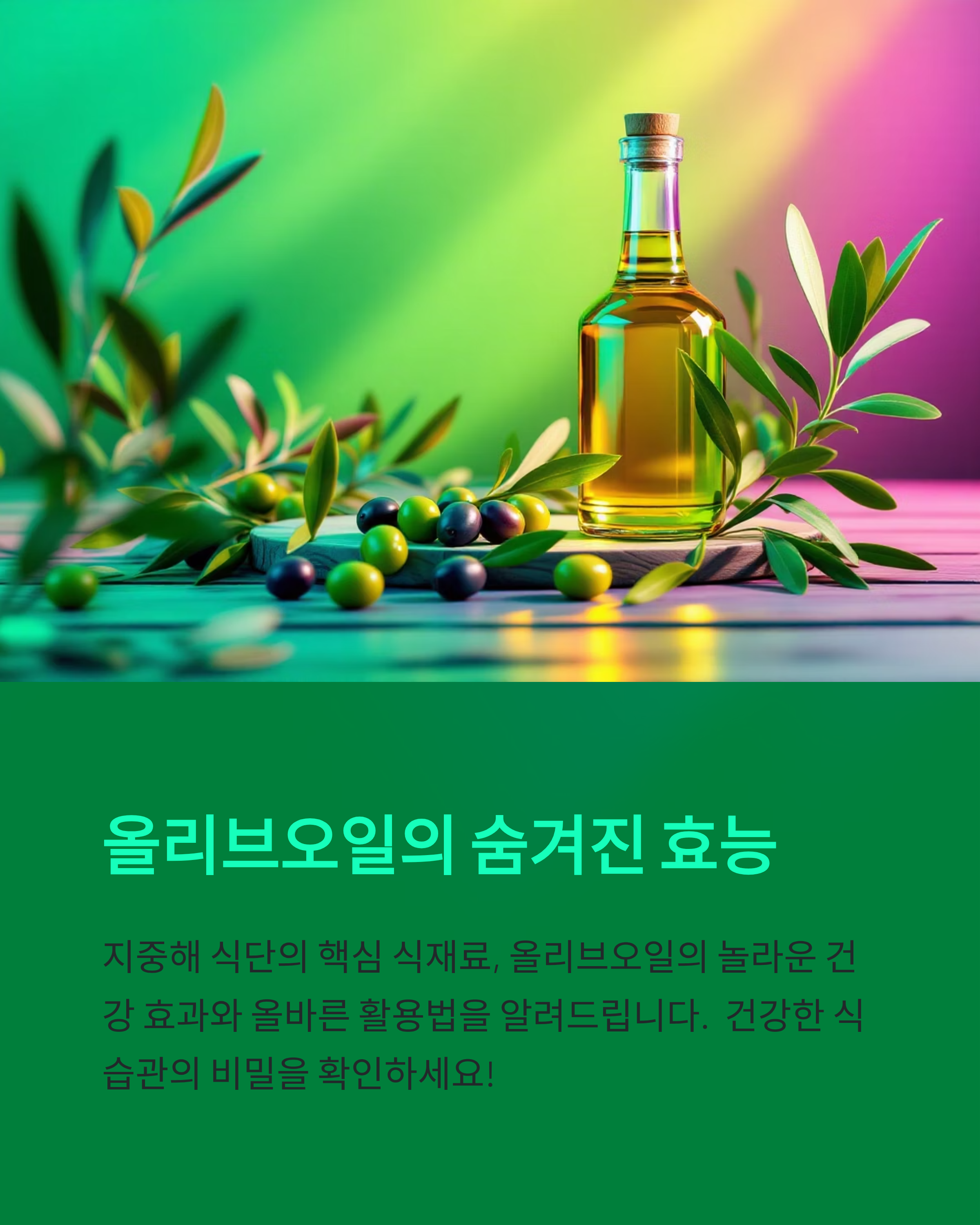 올리브오일은 심혈관 건강, 항산화, 소화 개선, 면역력 강화 등 다양한 효능이 있지만, 과다 섭취 시 소화 장애, 체중 증가, 약물 상호작용 같은 부작용이 있을 수 있습니다. 올바른 섭취법과 보관법을 지킨다면, 올리브오일은 식탁 위 최고의 건강 파트너가 될 수 있습니다.