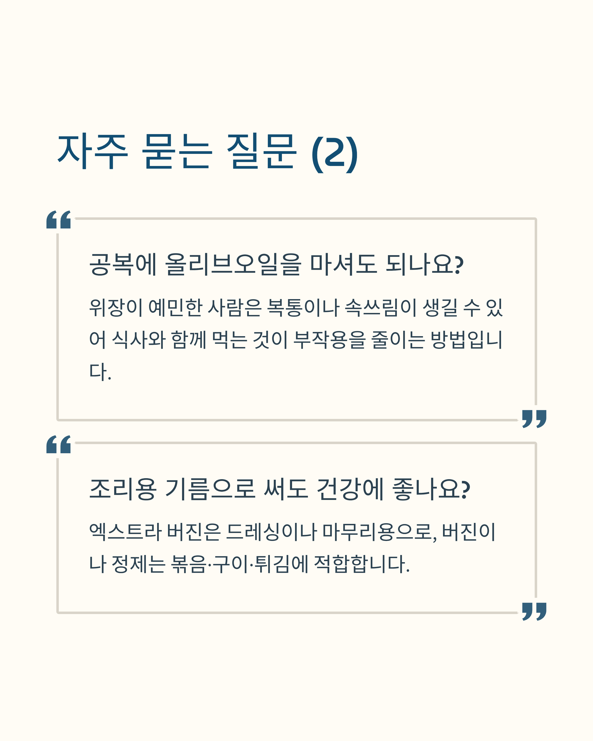 A. 엑스트라 버진 올리브오일은 고온에서 산화될 수 있어 드레싱이나 마무리 용도로 가장 적합합니다. 일반 버진이나 정제 올리브오일은 볶음·구이·튀김에 사용할 수 있습니다. 조리 시에도 과다 사용하면 설사·복통 같은 올리브오일 효능 부작용이 생길 수 있어 주의해야 합니다.