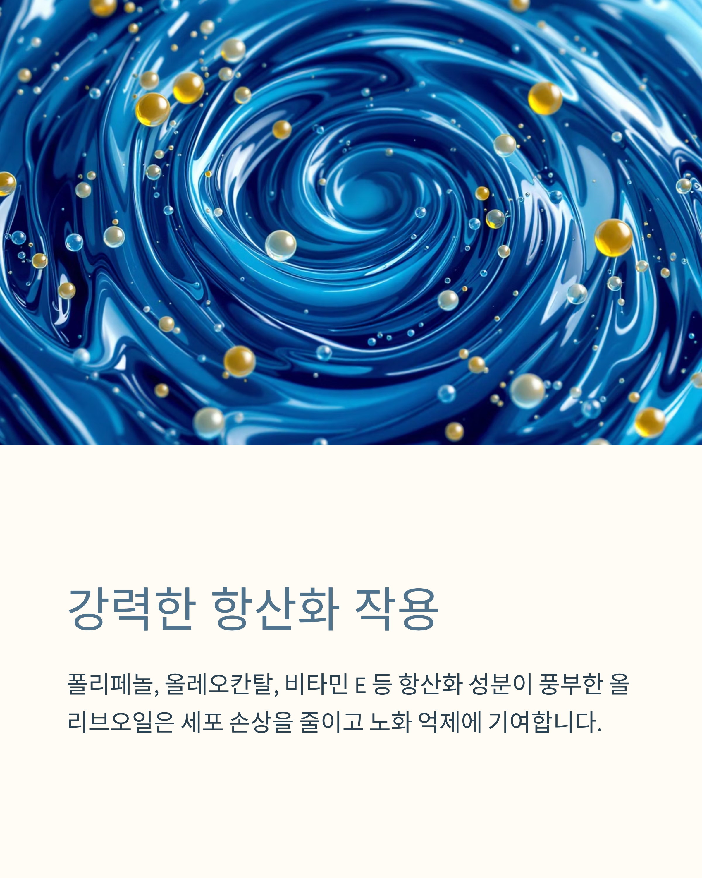 - 폴리페놀, 올레오칸탈, 비타민 E 등 항산화 성분이 세포 손상을 줄이고 노화 억제에 기여합니다.