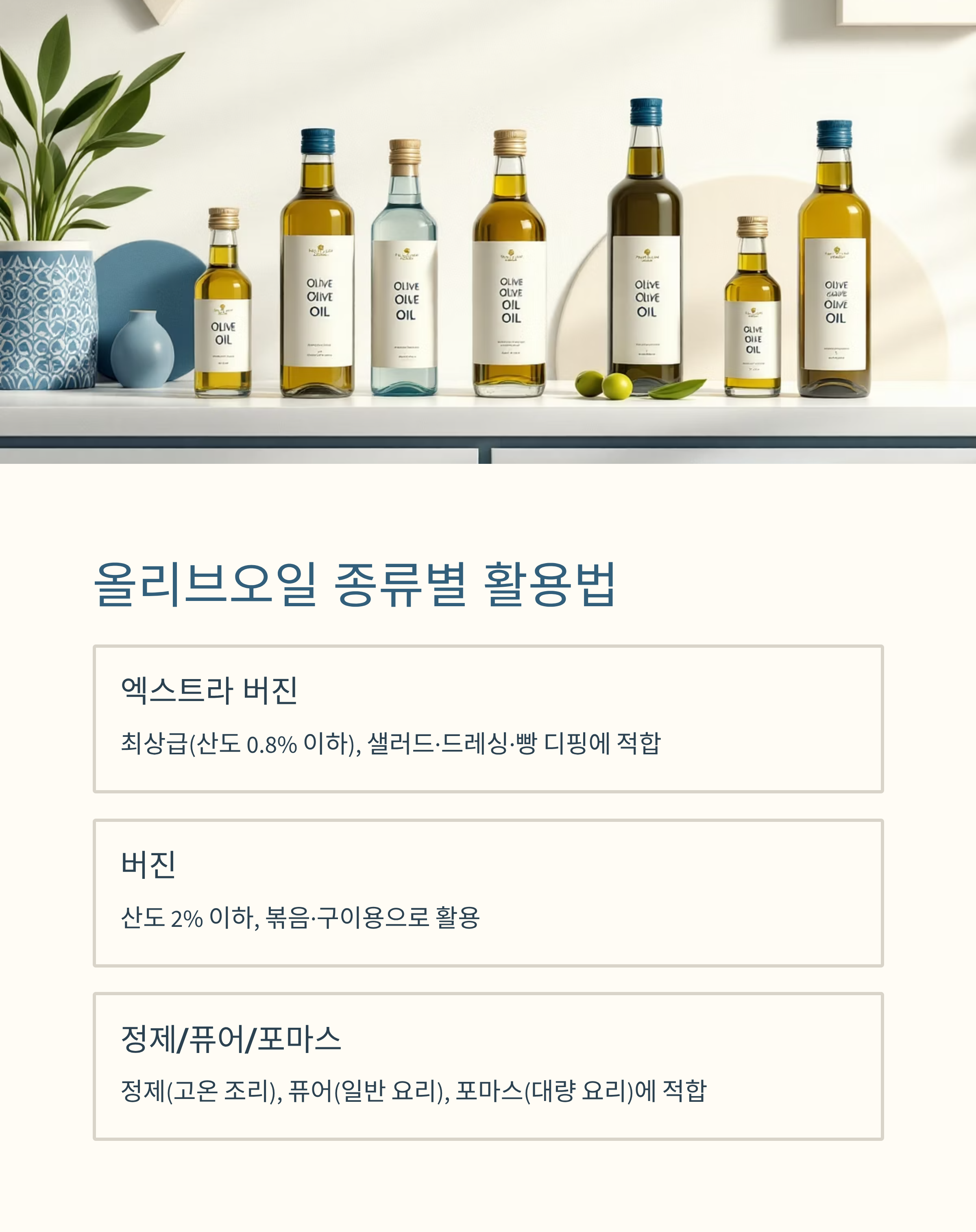 - 엑스트라 버진: 최상급(산도 0.8% 이하), 샐러드·드레싱·빵 디핑에 적합