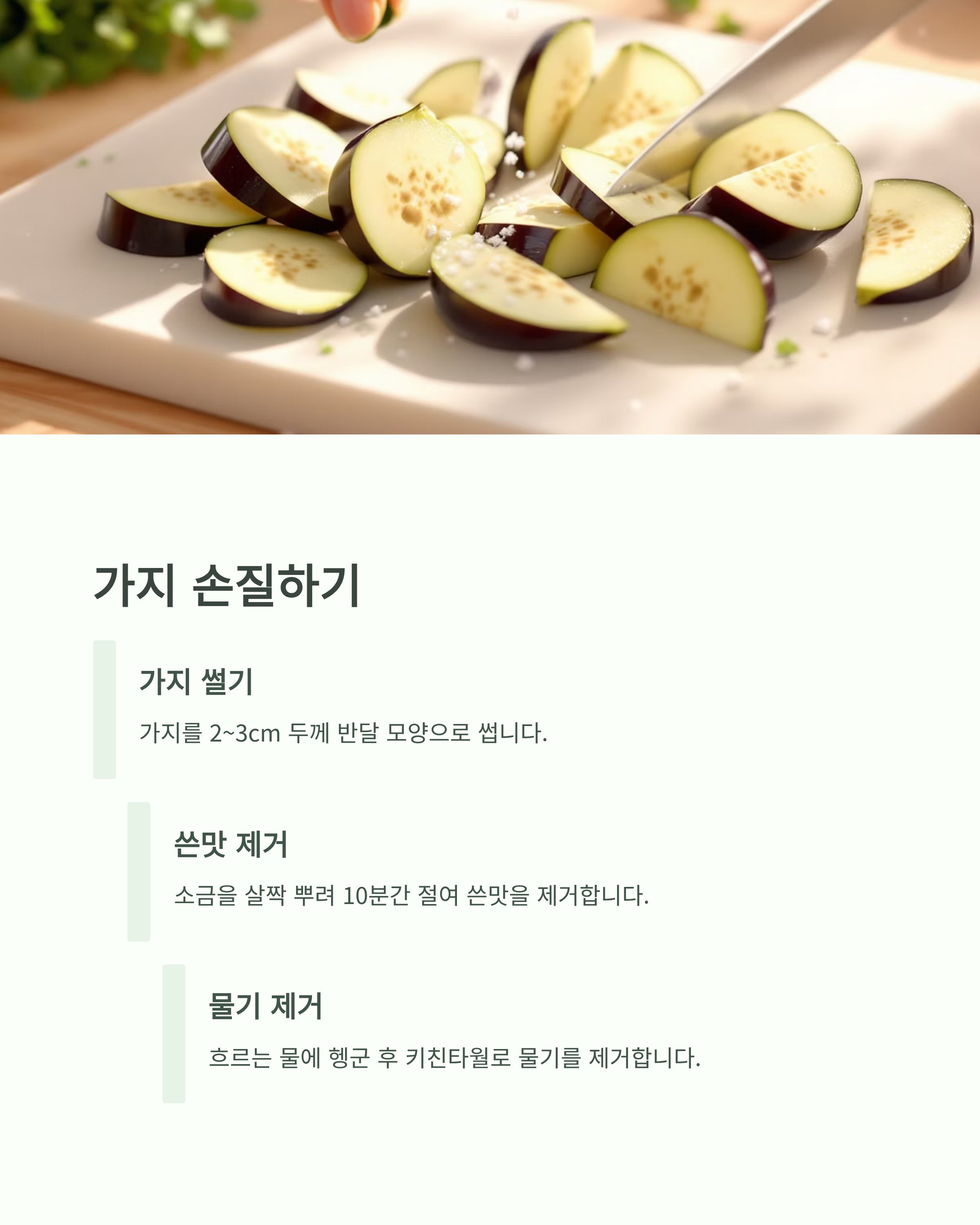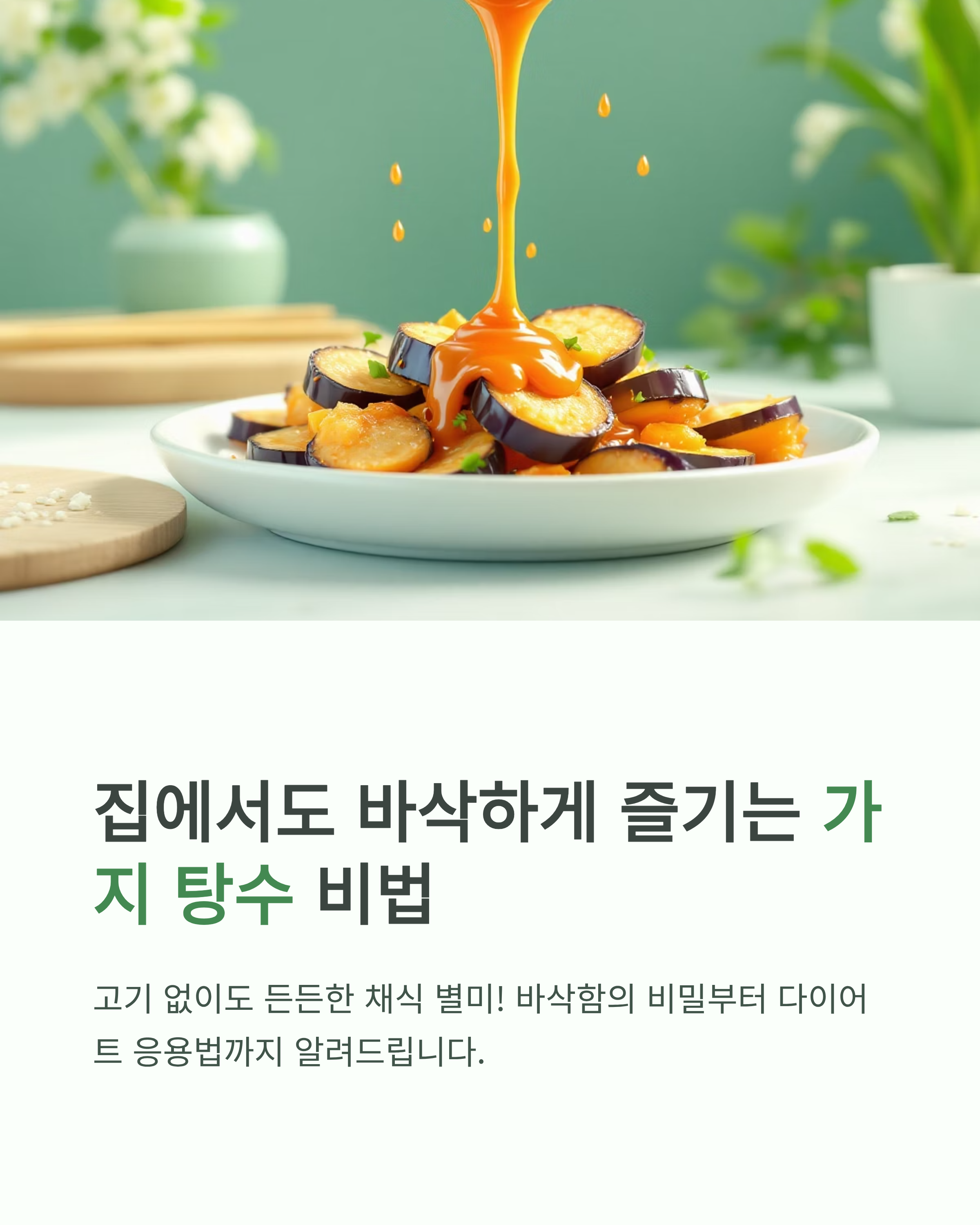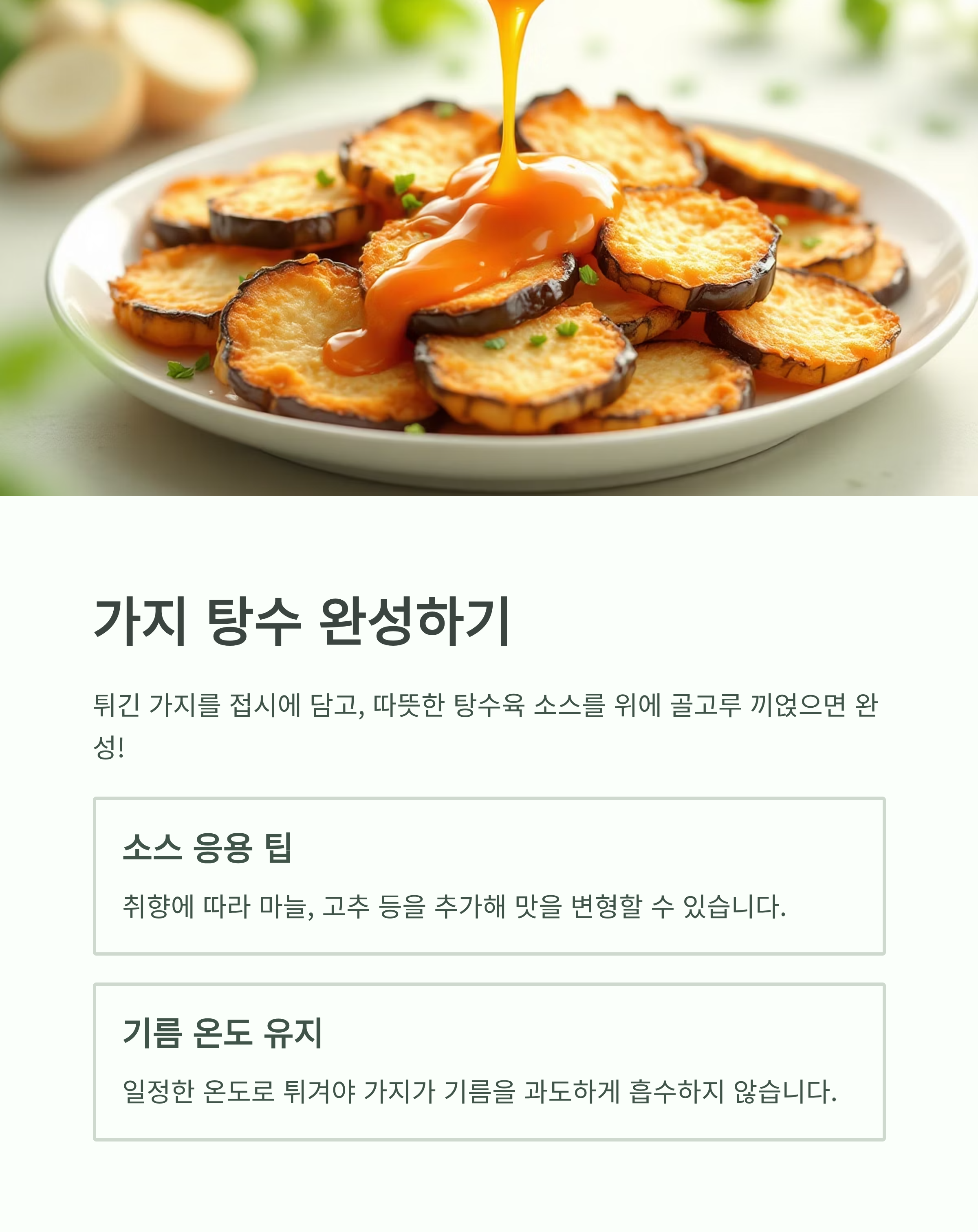 - 가지는 반드시 두 번 튀겨야 바삭함 유지와 기름기 절감이 가능합니다.