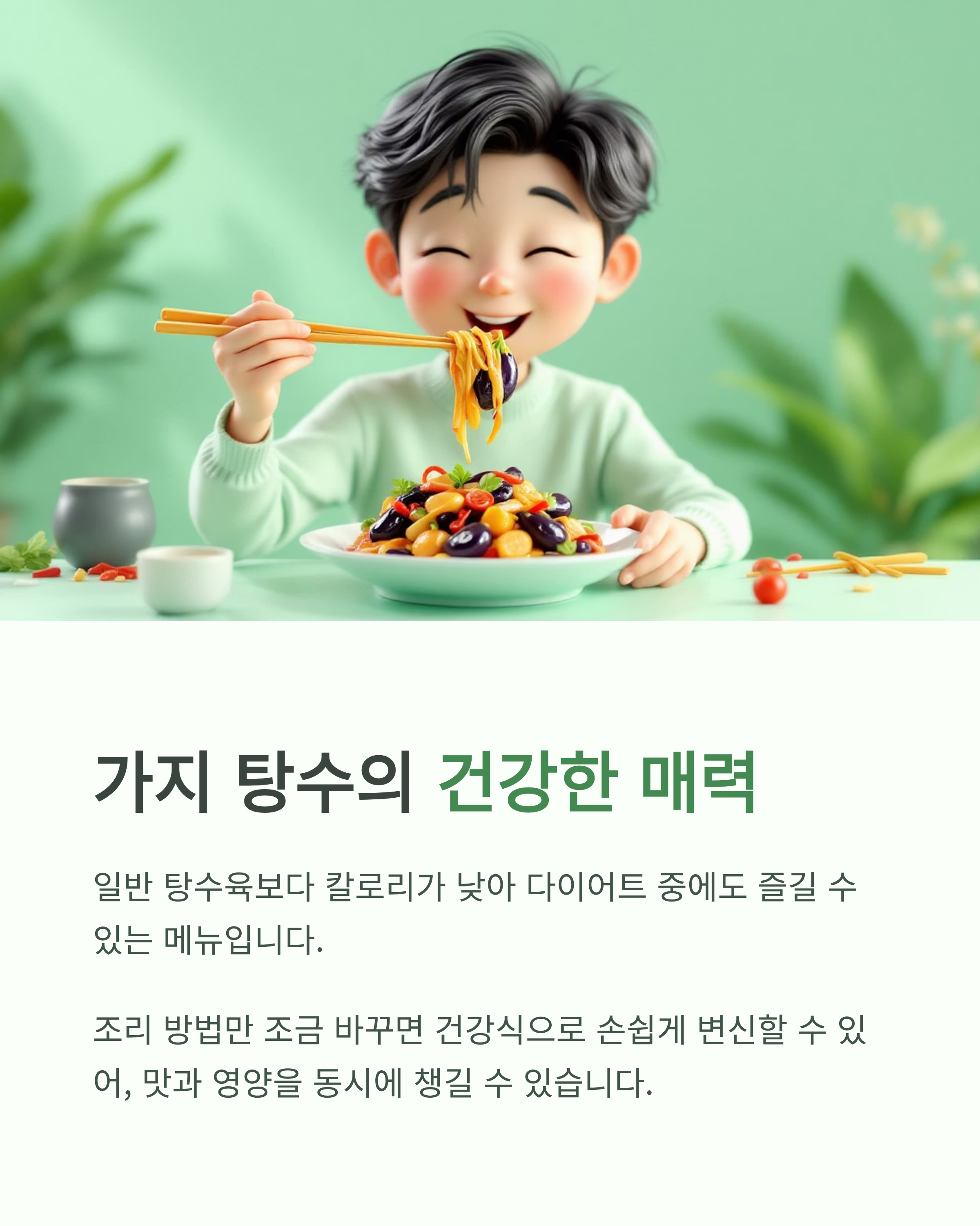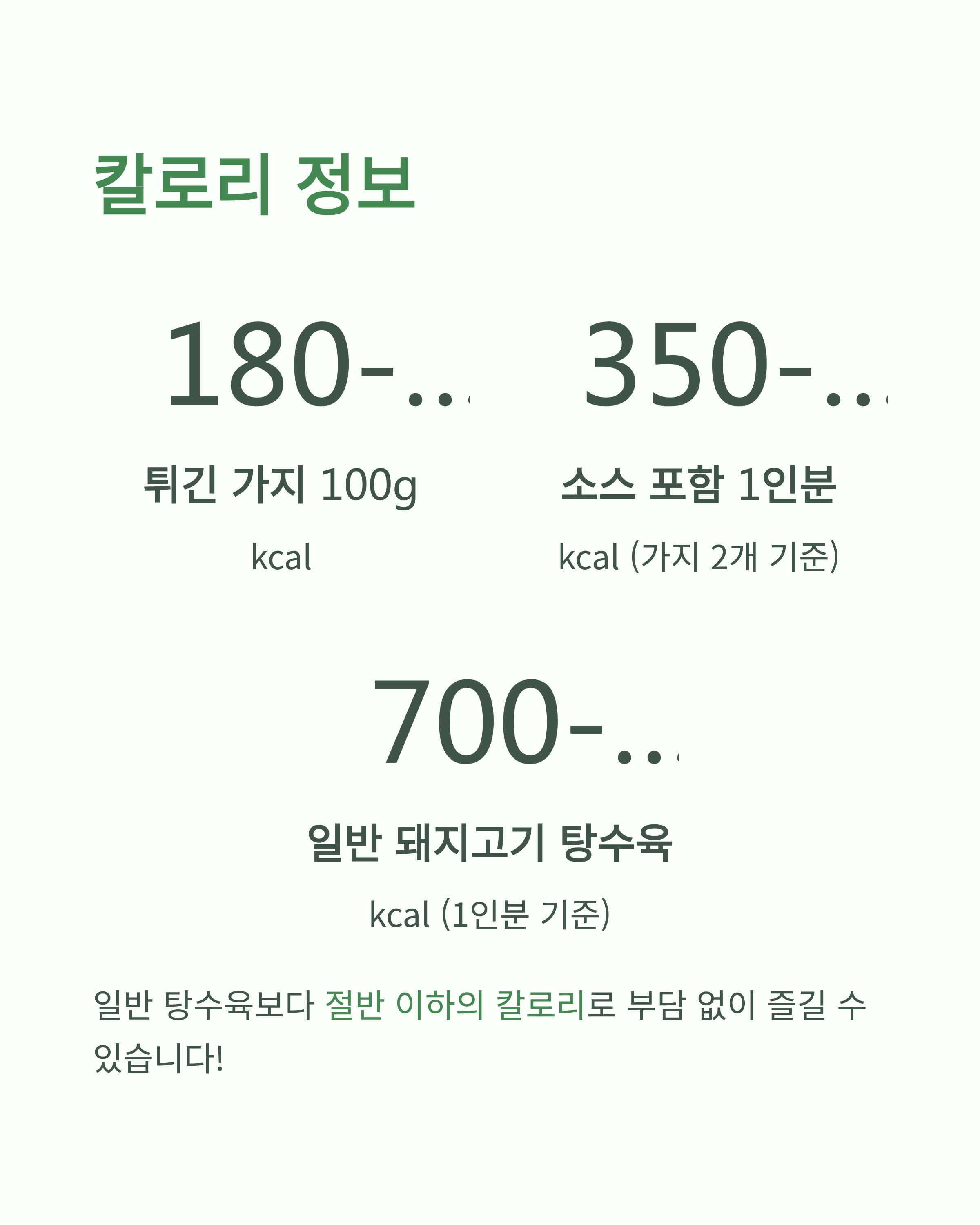 👉 정리하면, 가지 탕수는 일반 탕수육보다 칼로리가 낮아 다이어트 중에도 즐길 수 있는 메뉴입니다. 조리 방법만 조금 바꾸면 건강식으로 손쉽게 변신할 수 있어, 맛과 영양을 동시에 챙길 수 있습니다.