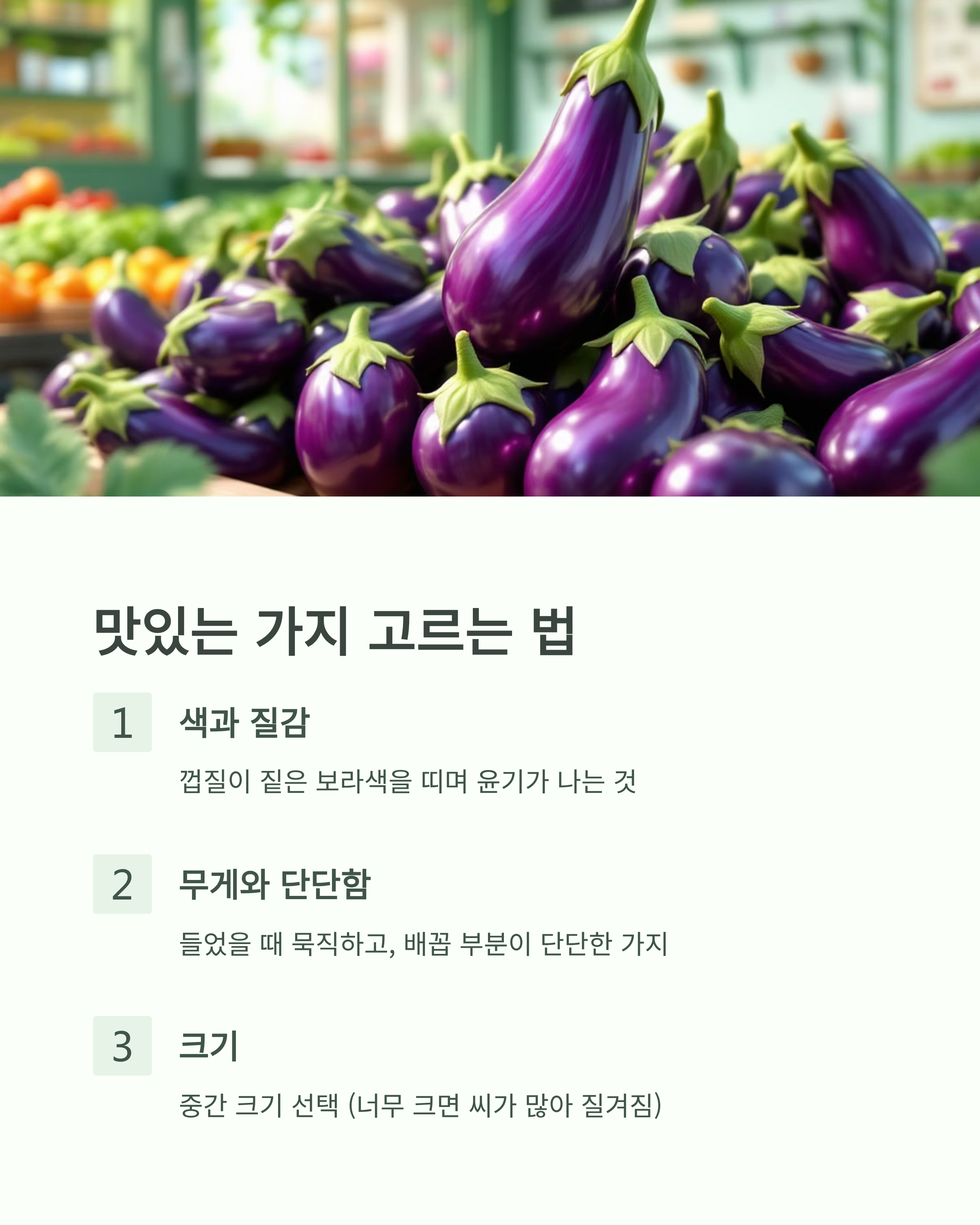 맛있고 신선한 가지를 고르는 것이 요리의 첫걸음입니다.