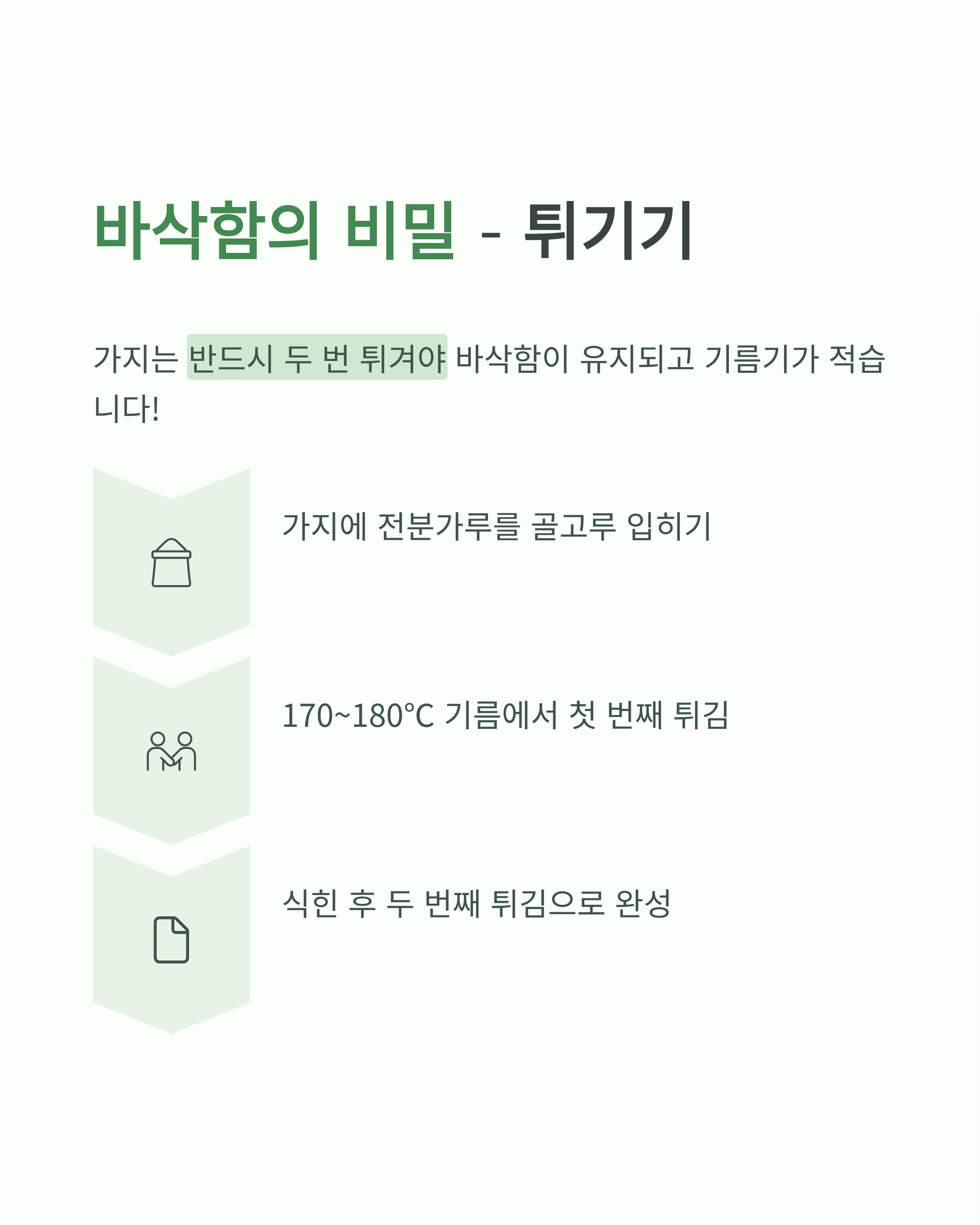 → 두 번 튀겨야 바삭하고 기름기도 적습니다.
