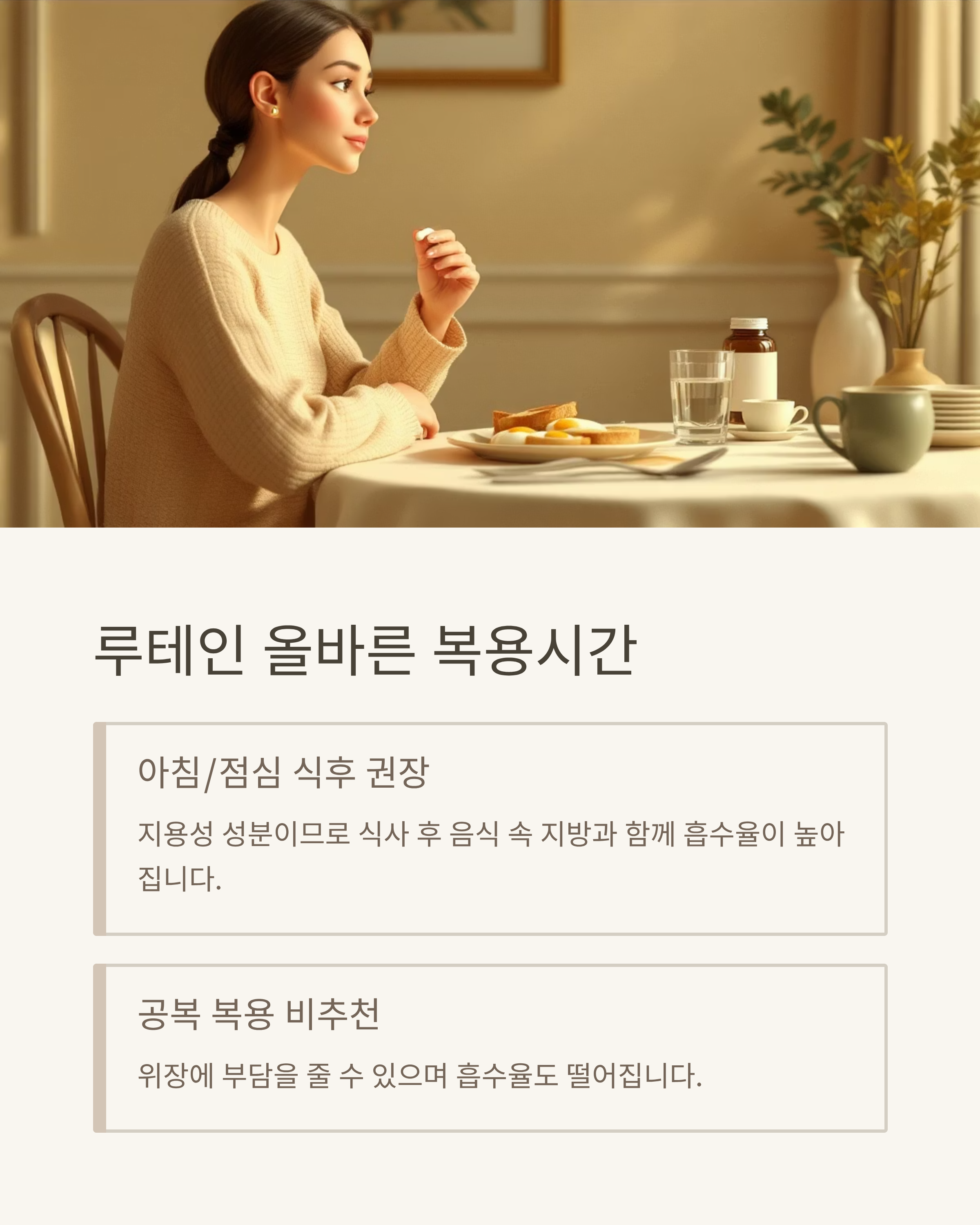- 식사 후에는 음식 속 지방과 함께 흡수율이 높아집니다.
