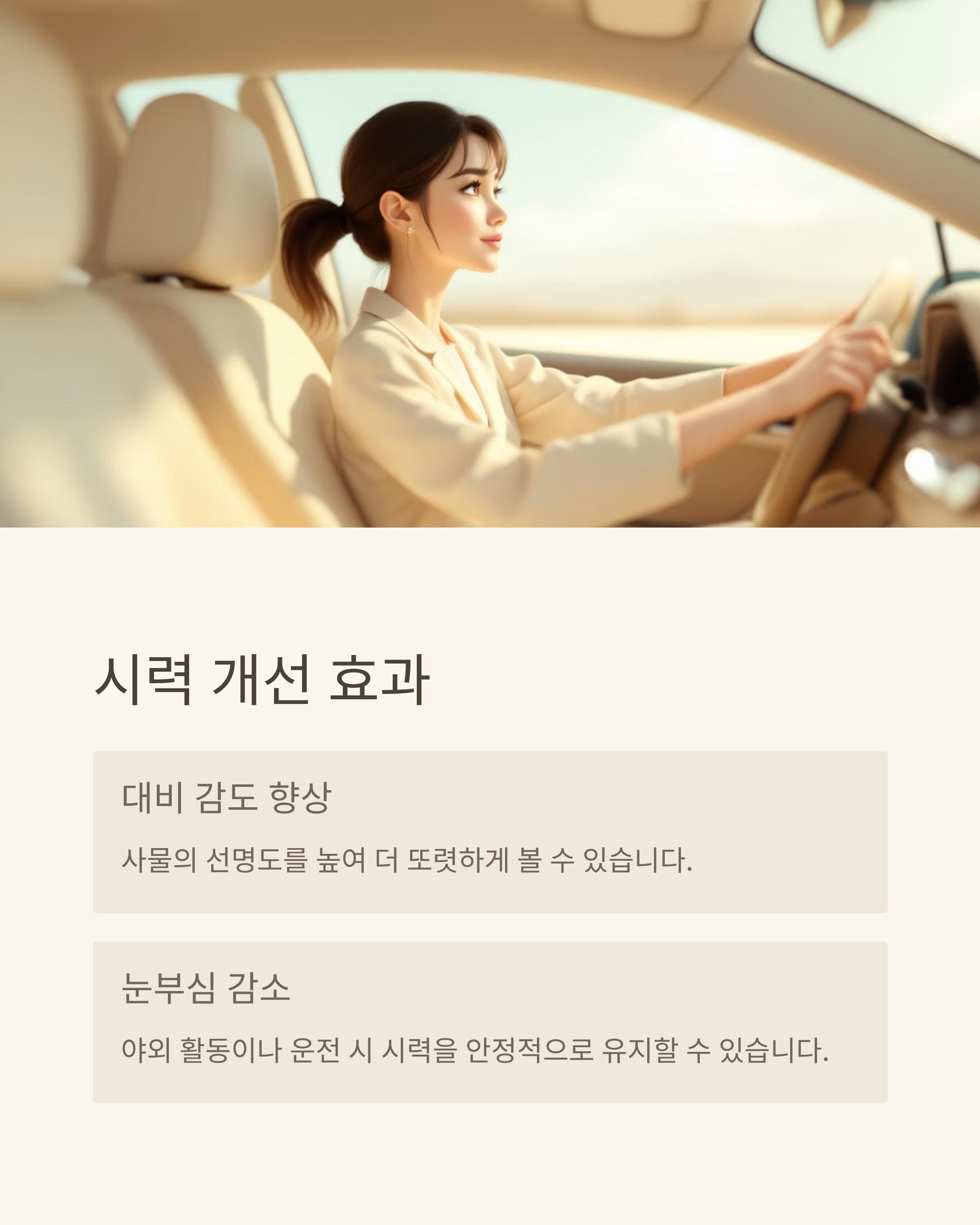 - 눈부심을 줄여 야외 활동이나 운전 시 시력을 안정적으로 유지할 수 있습니다.