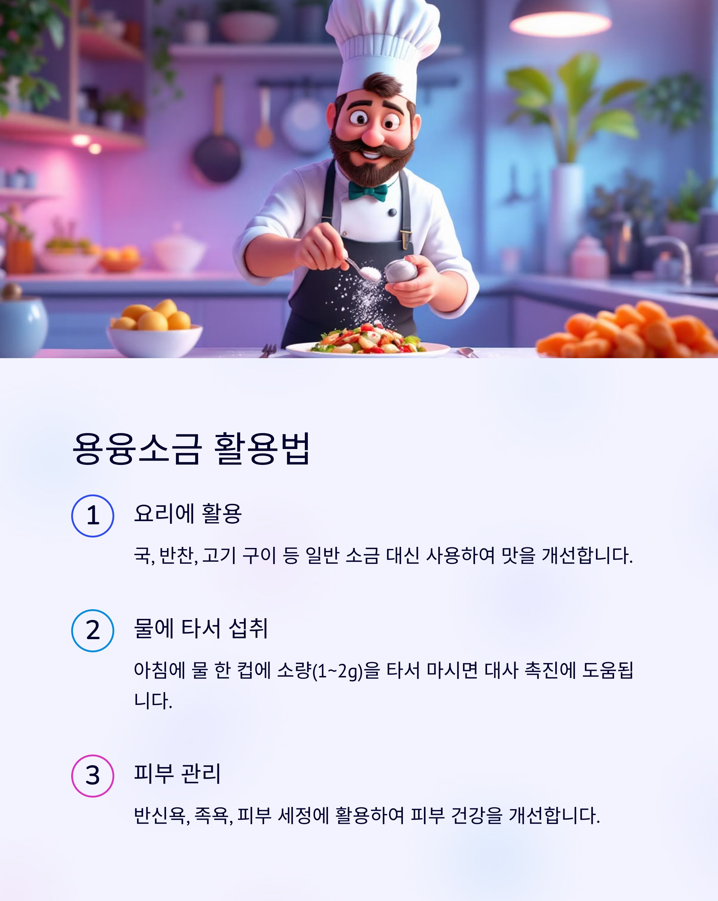 - 일반 소금 대용: 국, 반찬, 고기 구이 등 요리에 활용