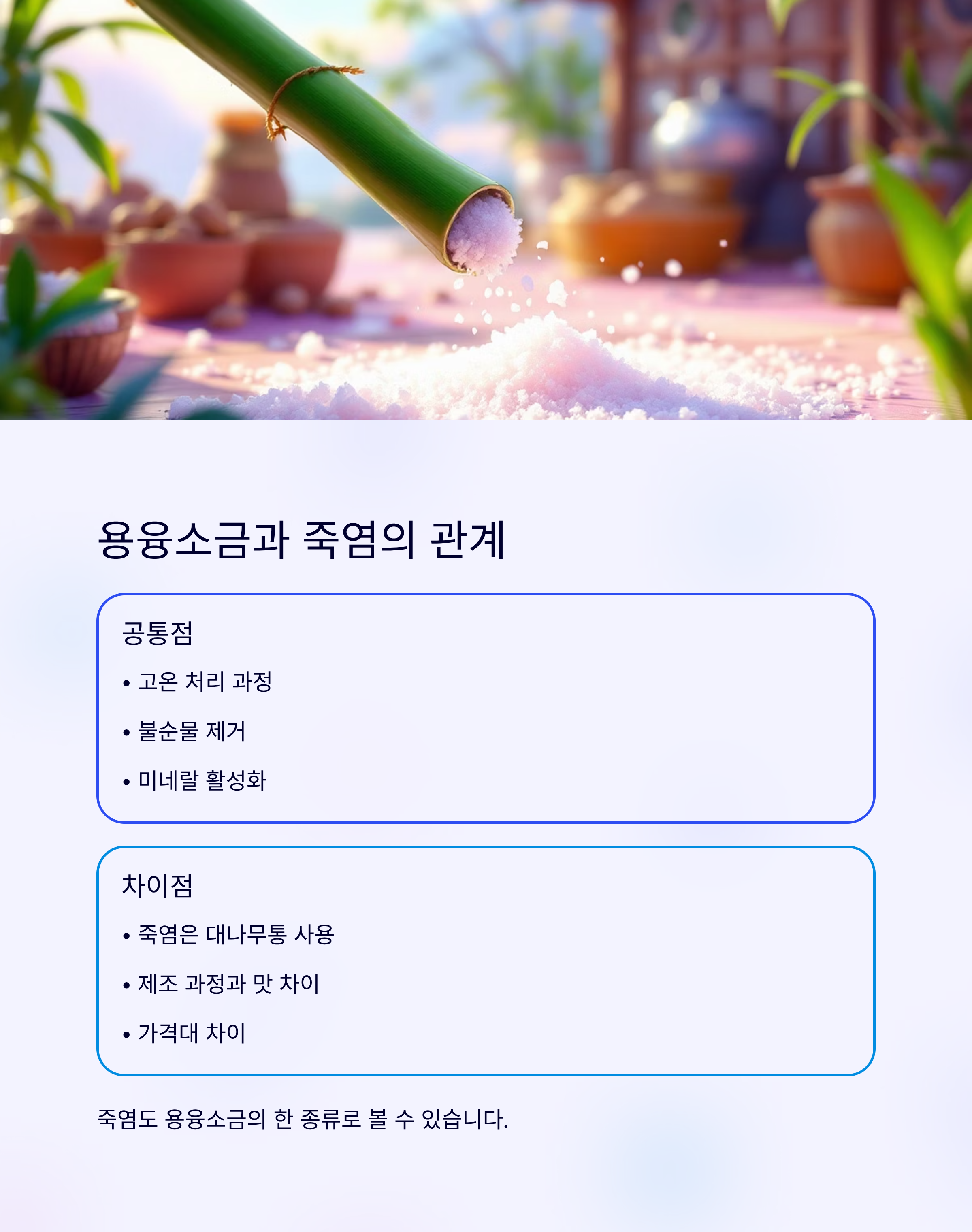 - 죽염과의 차이: 죽염도 고온에서 가열 처리하는 과정이 있어 용융소금의 한 종류에 해당