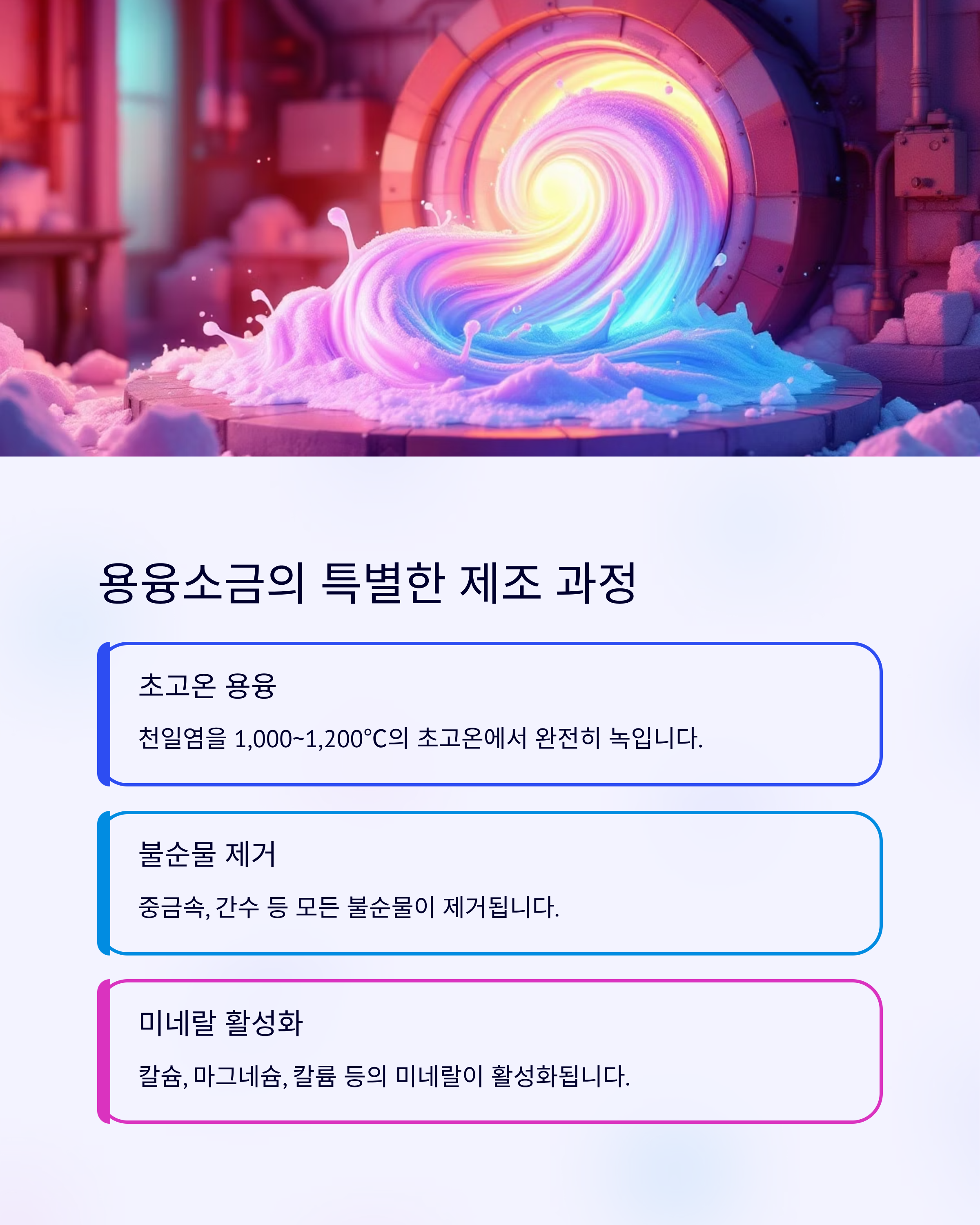 - 제조 과정: 초고온(1,000℃ 이상)에서 소금을 녹여 중금속, 간수 등 불순물을 완전히 제거