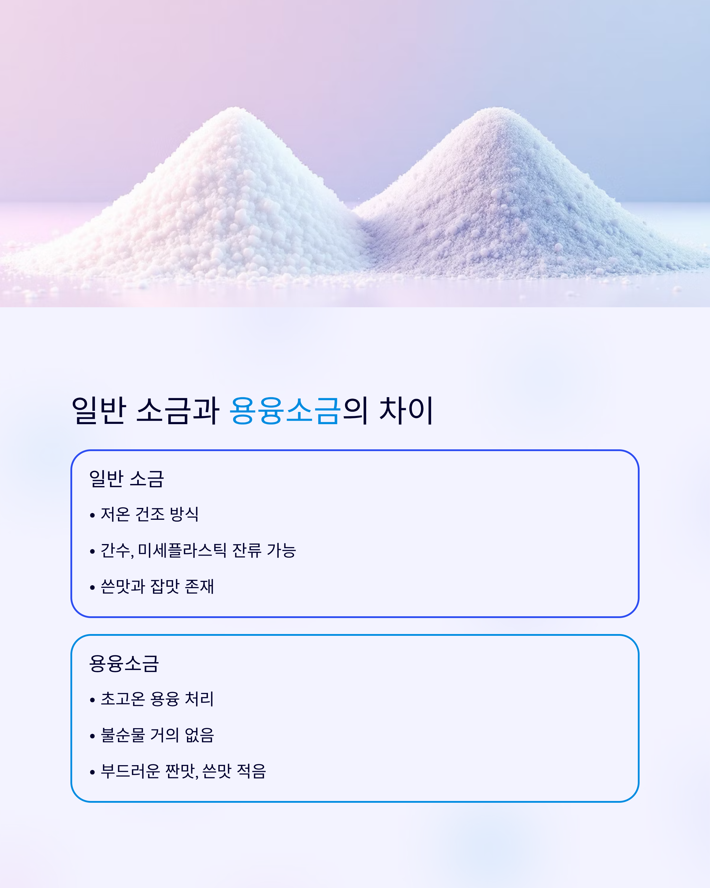 | 제조 구분 법 | 초고온 용융·불순물 제거 | 저온 건조, 간수·미세플라스틱 잔류 가능성 |