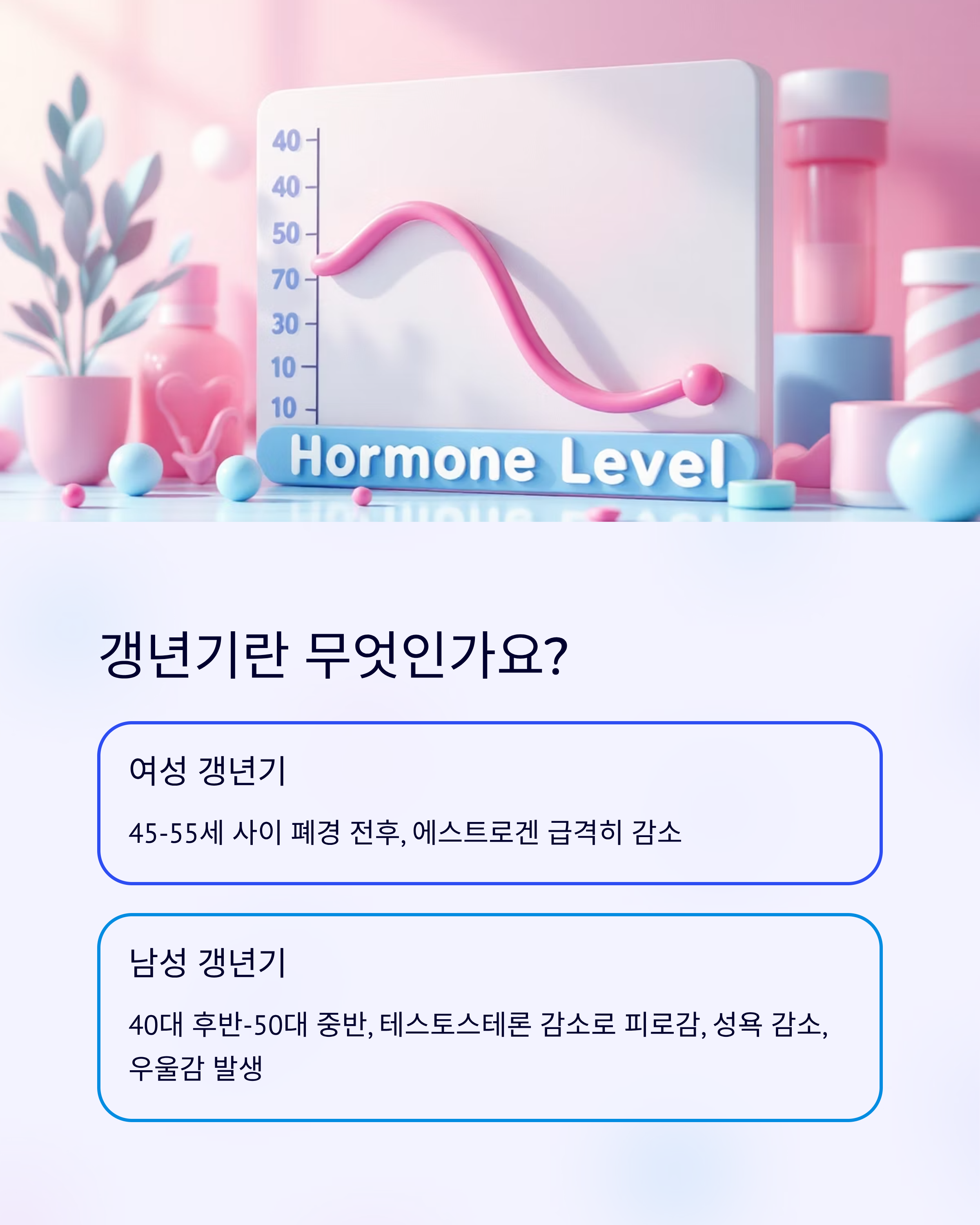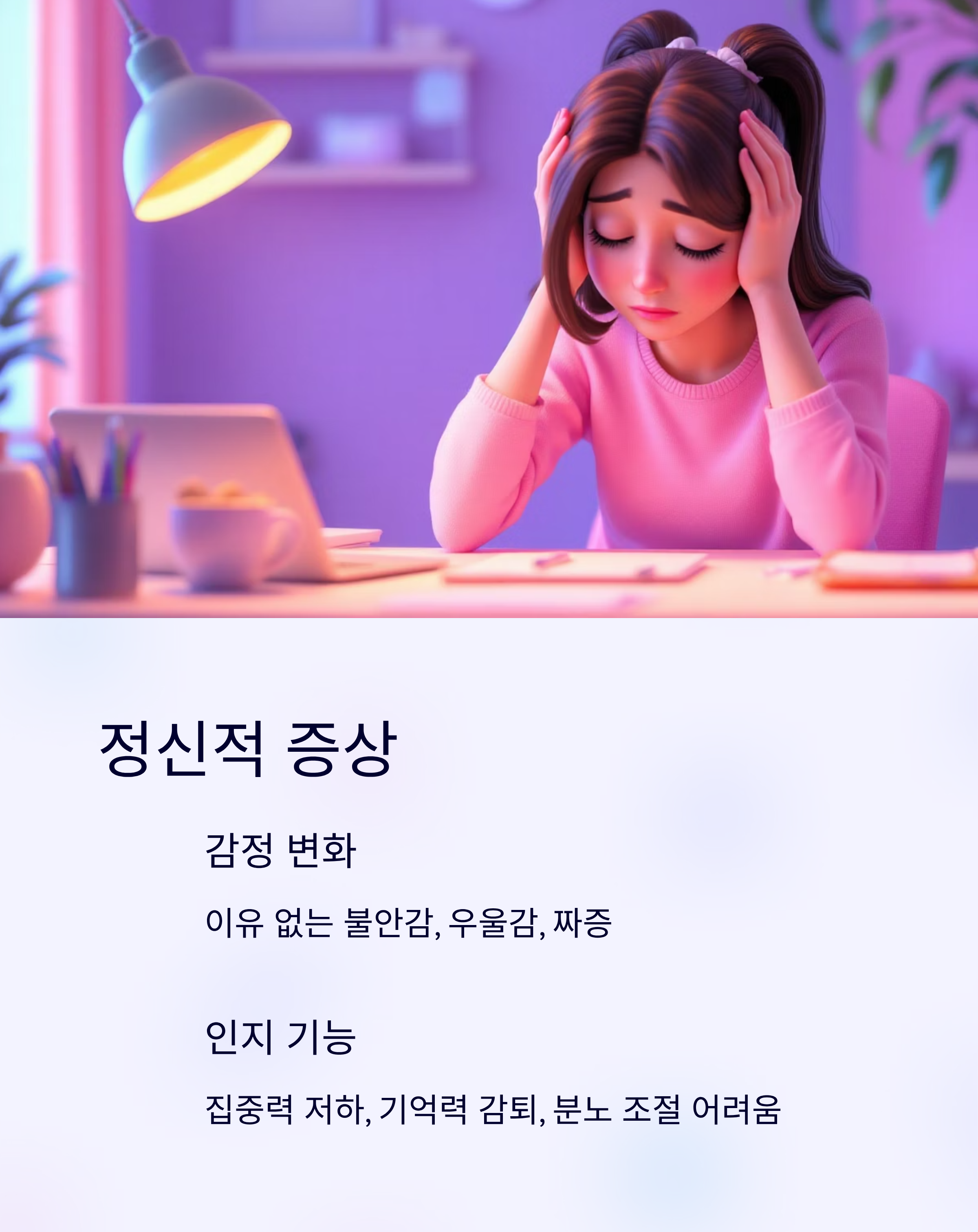 - 여성 갱년기: 보통 45세~55세 사이 폐경 전후에 나타나며, 에스트로겐이 급격히 줄어들면서 다양한 증상이 발생합니다.