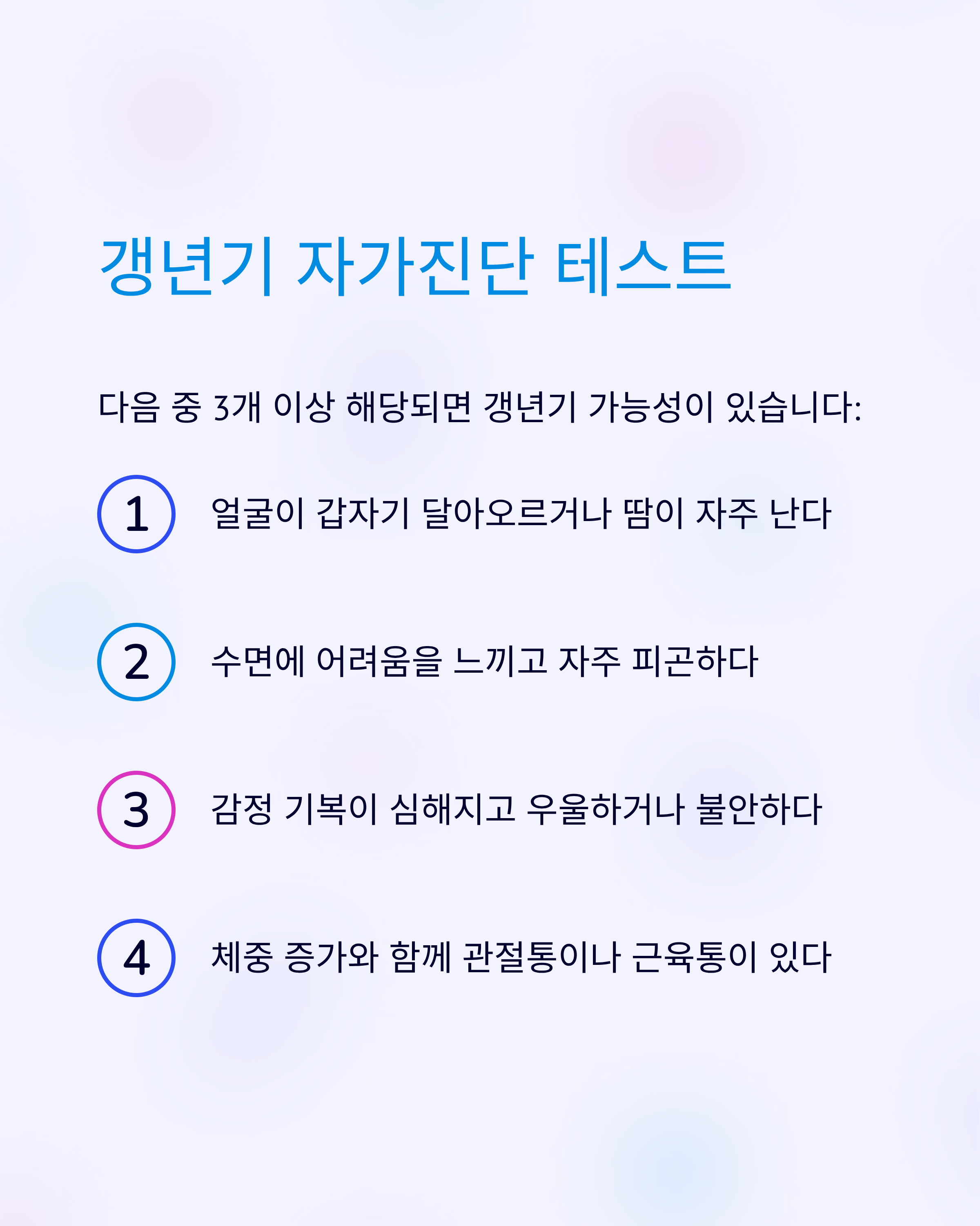 다음 항목 중 3개 이상 해당되면 갱년기 가능성이 있으며, 증상 정도에 따라 관리 방법이 달라집니다.