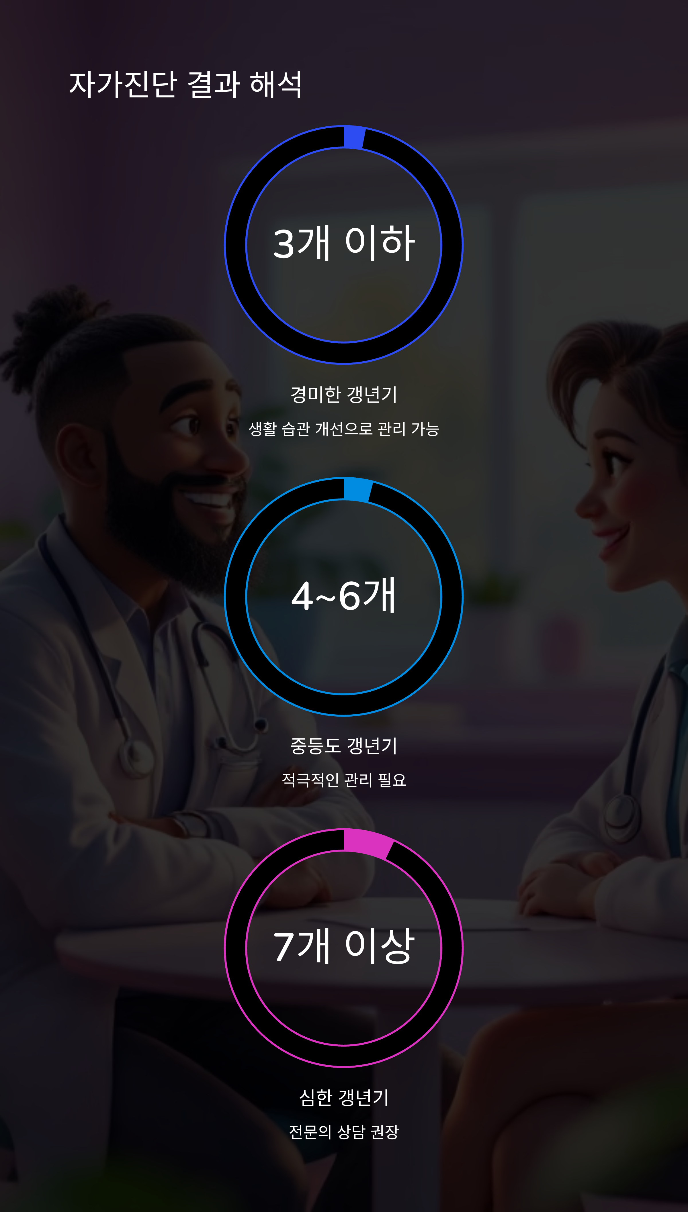 A3. 자가진단은 초기 이상 징후를 확인하는 데 유용하지만, 정확한 갱년기 진단을 위해서는 전문의의 혈액검사나 상담이 필요합니다. 자가진단 결과가 중등도 이상이면 병원 방문을 권장합니다.