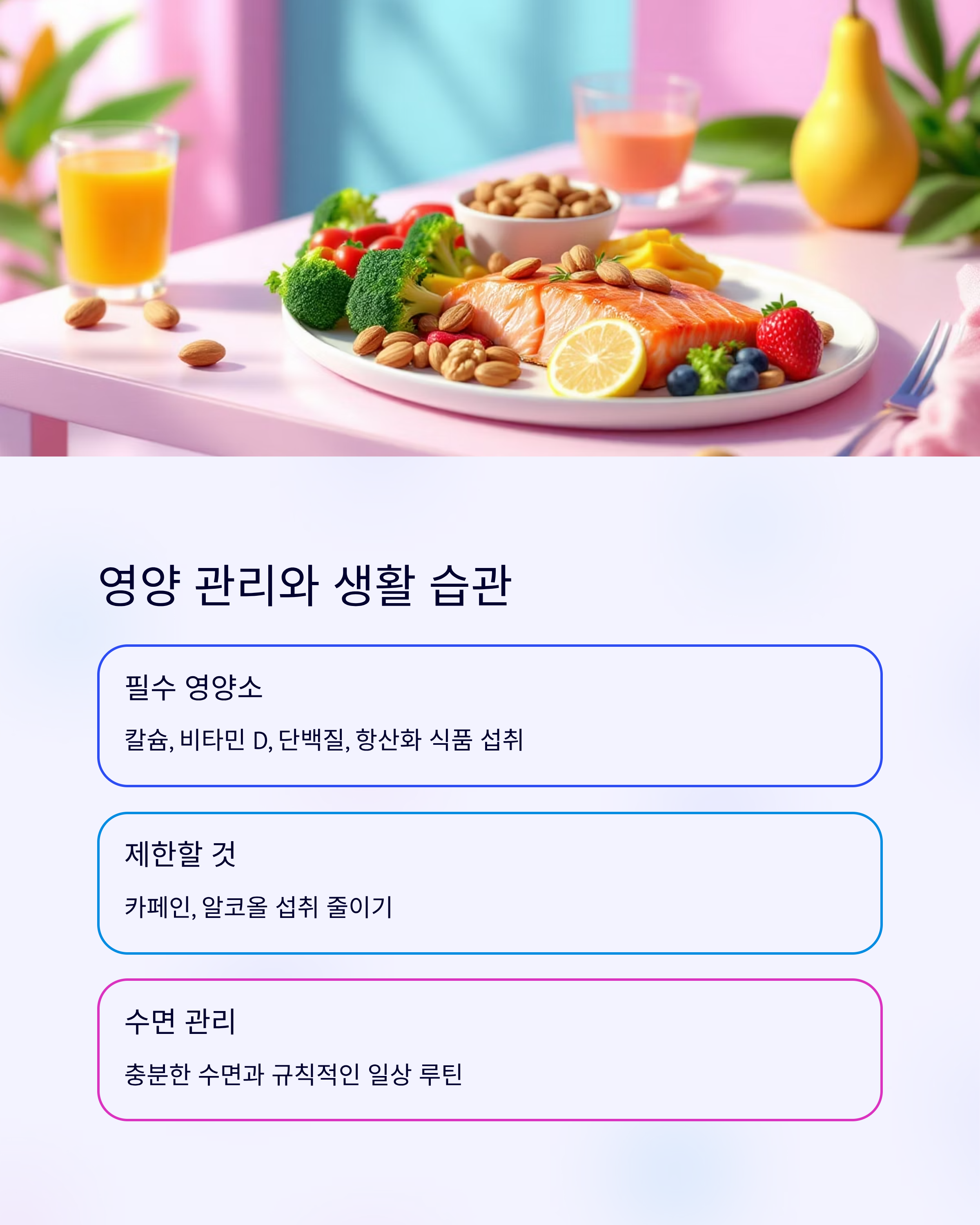 - 칼슘, 비타민 D: 뼈 건강 유지