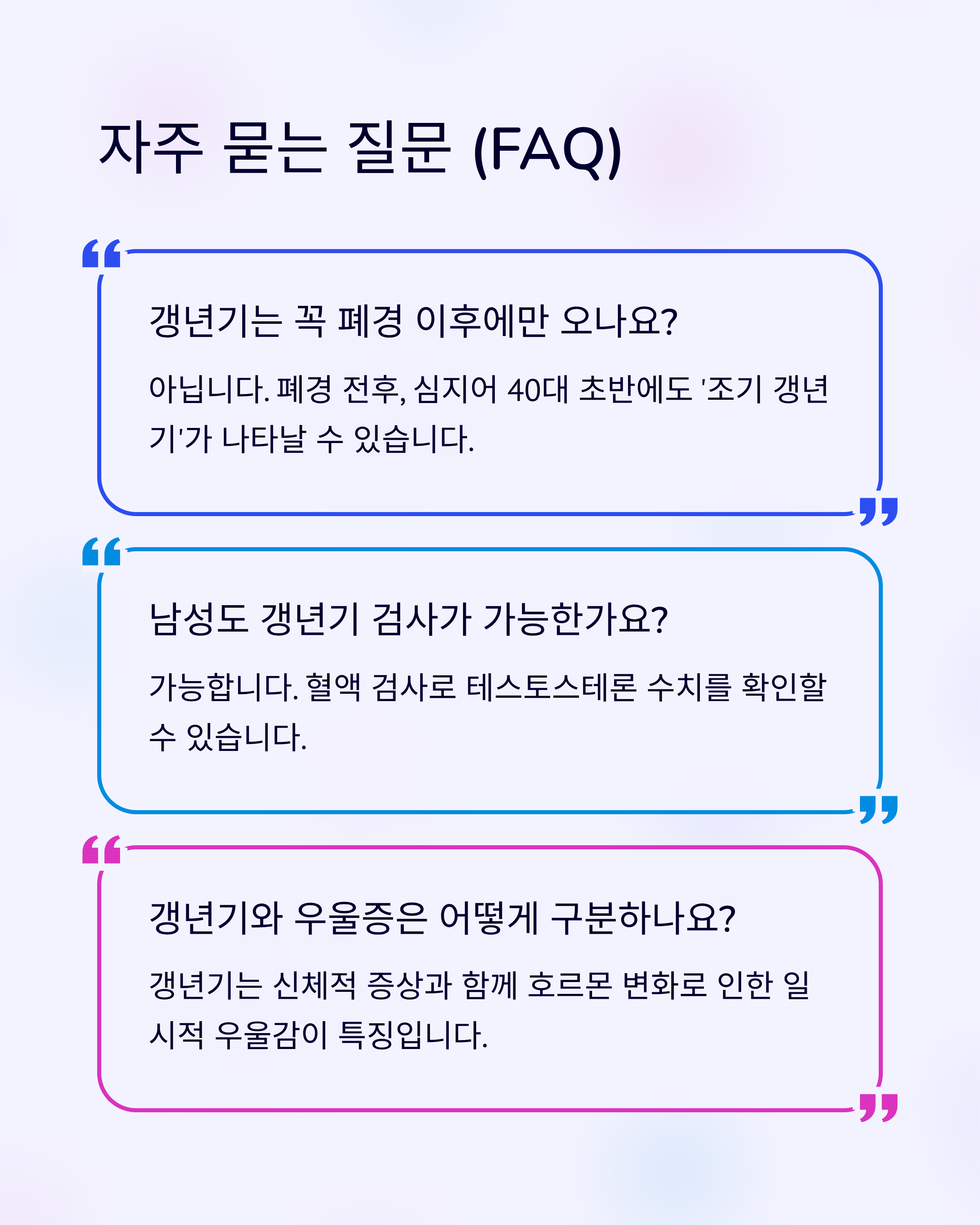 A4. 갱년기는 신체적 증상과 함께 감정 기복이 동반되며, 호르몬 변화로 인한 일시적 우울감이 특징입니다. 지속되는 심한 우울증은 별도 진단이 필요합니다.