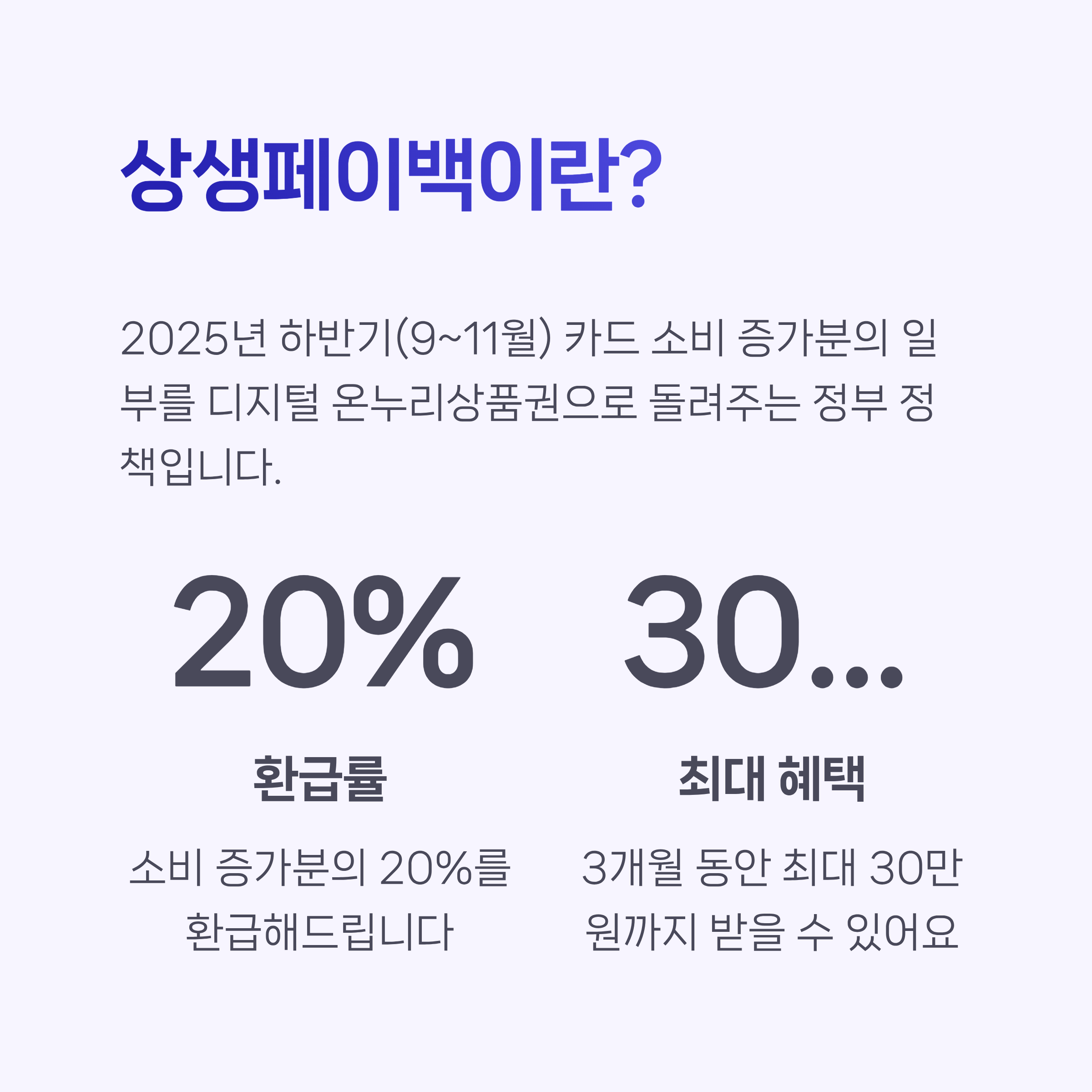 상생페이백은 2025년 하반기(9~11월) 카드 소비 증가분의 일부를 디지털 온누리상품권으로 돌려주는 정부 정책입니다. 지난해보다 소비를 많이 한 사람에게 최대 30만 원까지 혜택이 주어집니다.