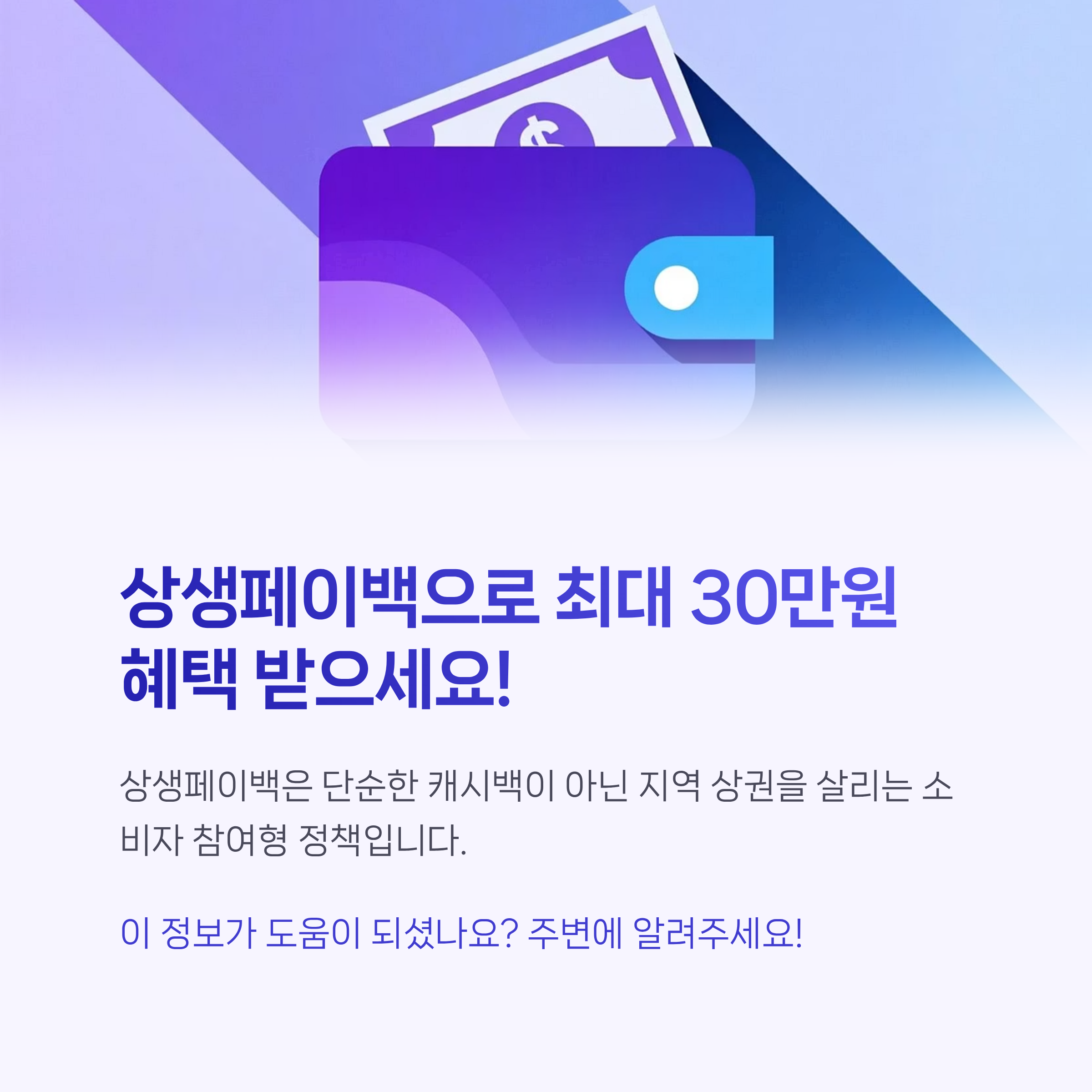 상생페이백은 단순한 카드 캐시백 제도가 아닙니다. 지역 상권을 살리는 소비자 참여형 정책입니다. 사용 실적만 잘 쌓아도 최대 30만 원 환급을 받을 수 있으니, 지금부터 9~11월 카드 사용 계획을 세워두세요.